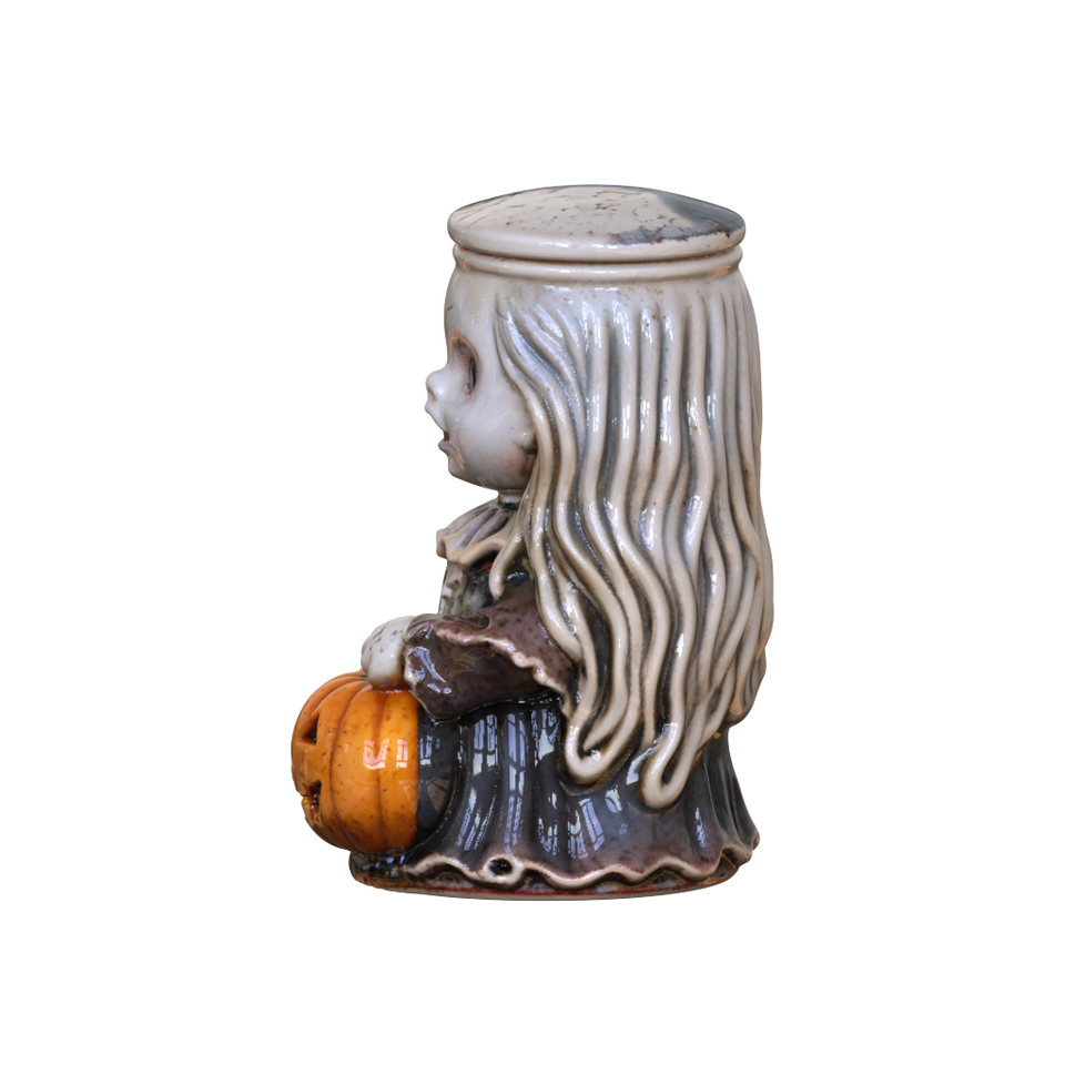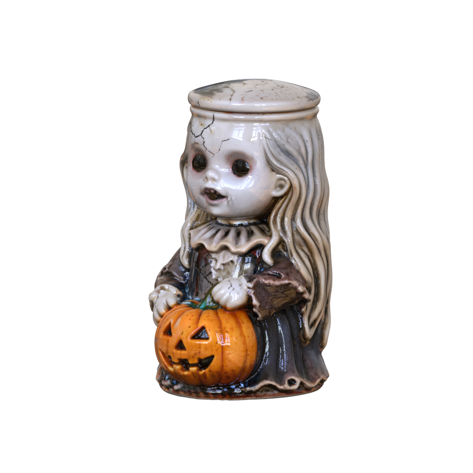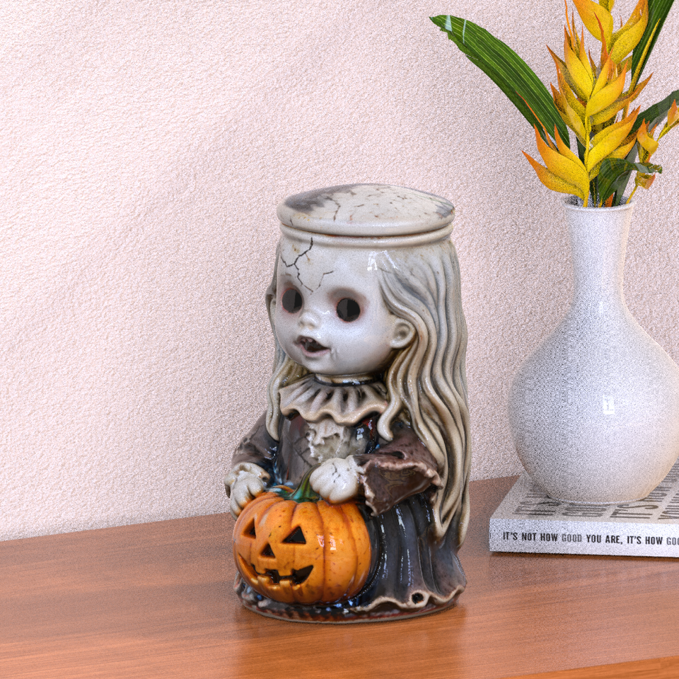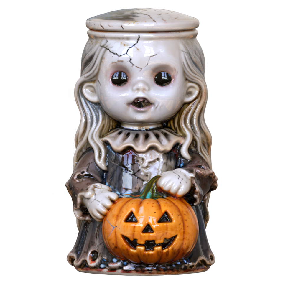 Conteneur en céramique sur mesure en gros, design effrayant, rime d'enfants d'horreur, poupée effrayante portant une lanterne en forme de citrouille, figurines, pots de rangement