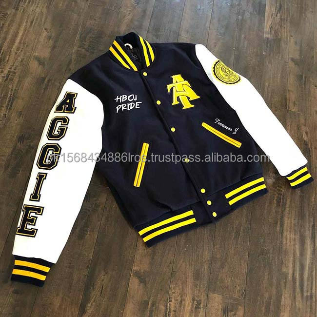 Veste universitaire design personnalisé en gros noir et blanc vestes universitaires de haute qualité manches en cuir véritable
