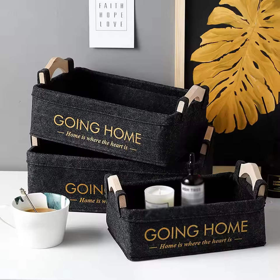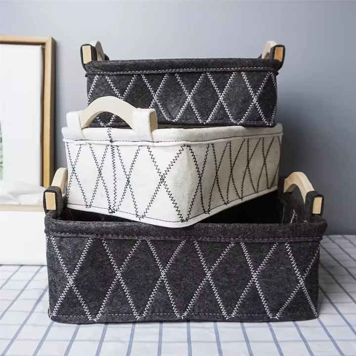 Wholesale Custom Desktop Storage Container Cosmetic Makeup Underwear Socks Bra Basket Felt Organizer Basket With Wooden Handle