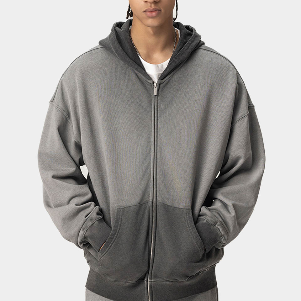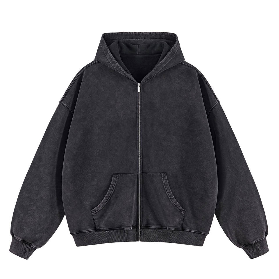 Vente en gros : Sweat à capuche zippé surdimensionné rétro en coton 100% épais, délavé à l'acide, à imprimé hiver, avec broderie personnalisée