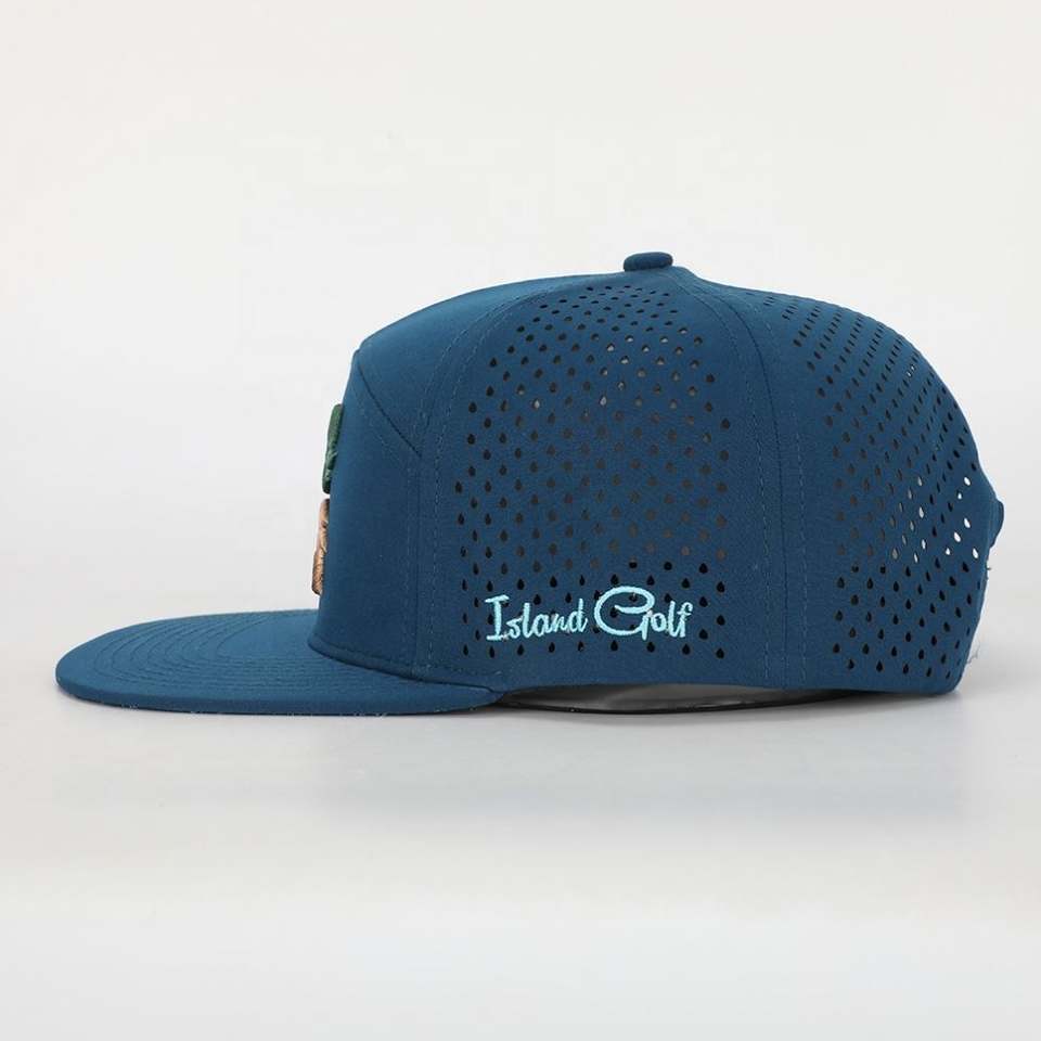 Chapeau à bord plat de 7 panneaux en polyester blanc de haute qualité pour le sport, casquette Snapback avec trou découpé au laser Vente en gros personnalisé brodé logo