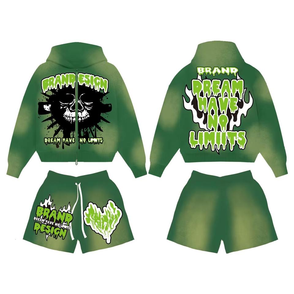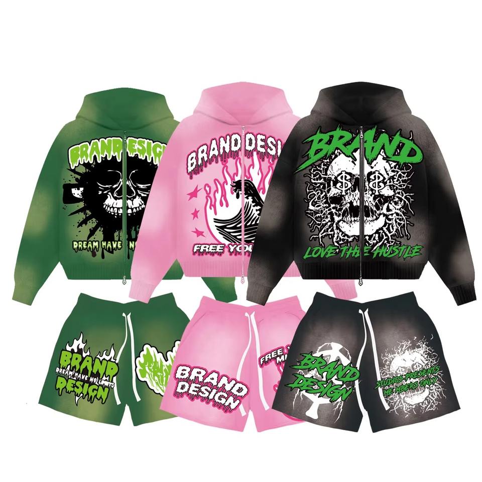 Ensemble 2 pièces personnalisé : Sweat à capuche zippé avec logo brodé et short en coton délavé à l'acide – Vente en gros