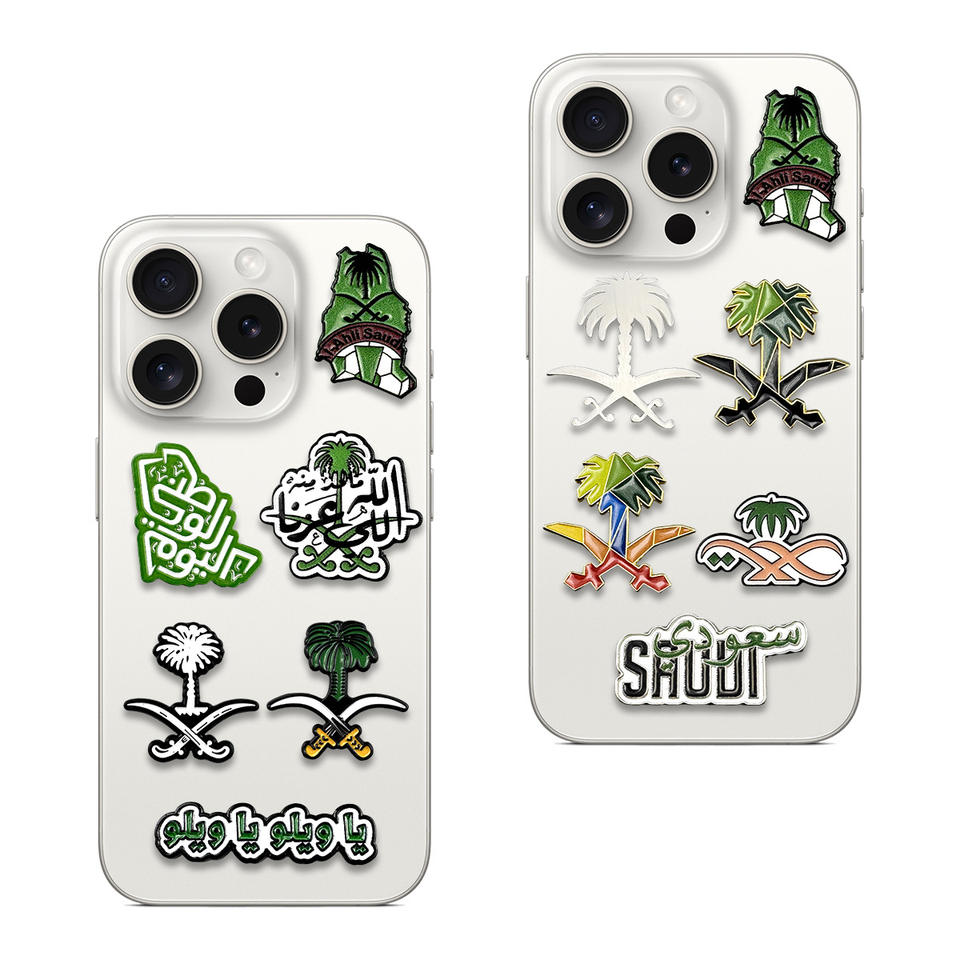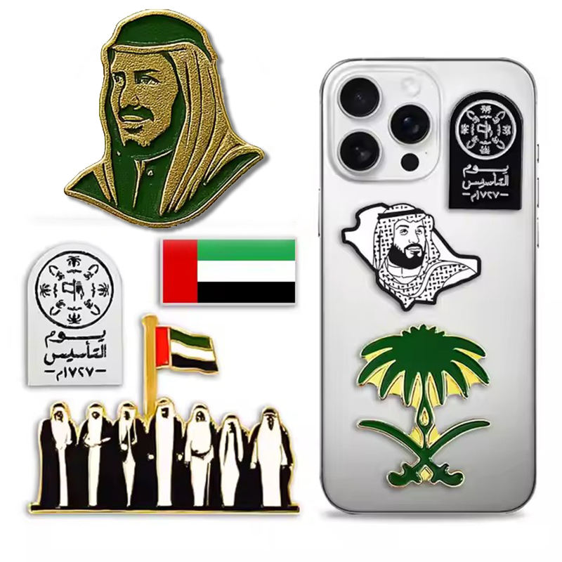 Autocollants de téléphone en métal plaqué, personnalisés, gravés, émaillés, avec logo moderne de l'Arabie Saoudite, écologiques et de couleur personnalisée, vente en gros