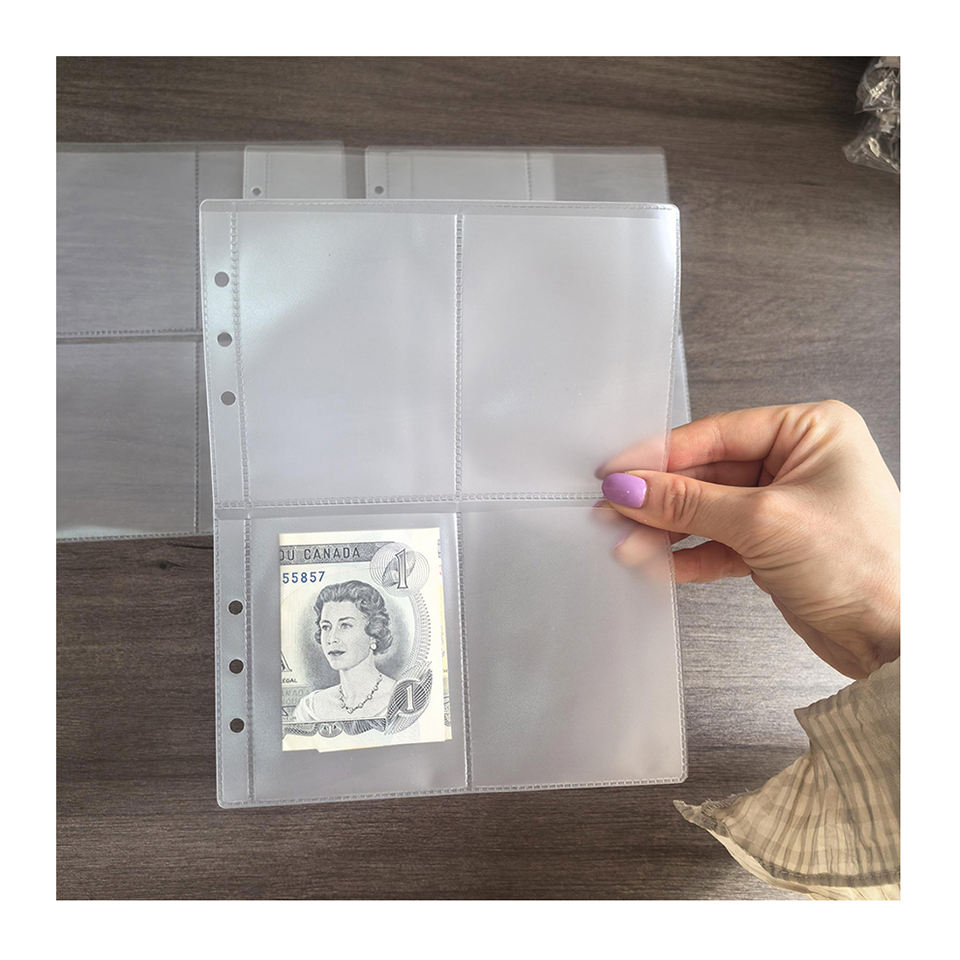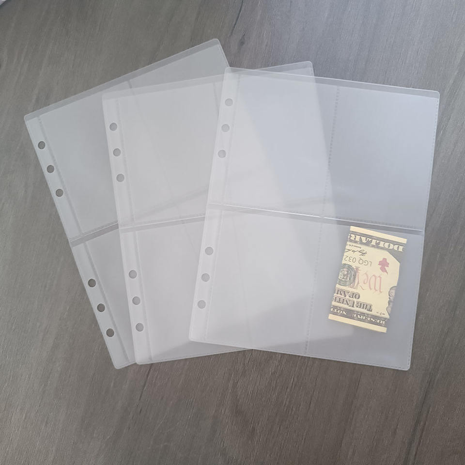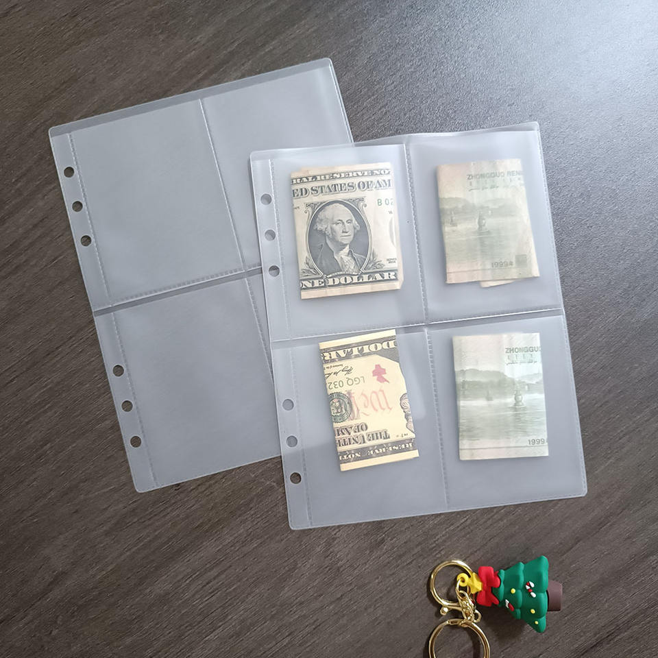 Vente en gros d'enveloppes à billets A5 personnalisées givrées, pochettes rechargeables à 4 poches, reliure à anneaux, pochettes de remplacement pour argent comptant