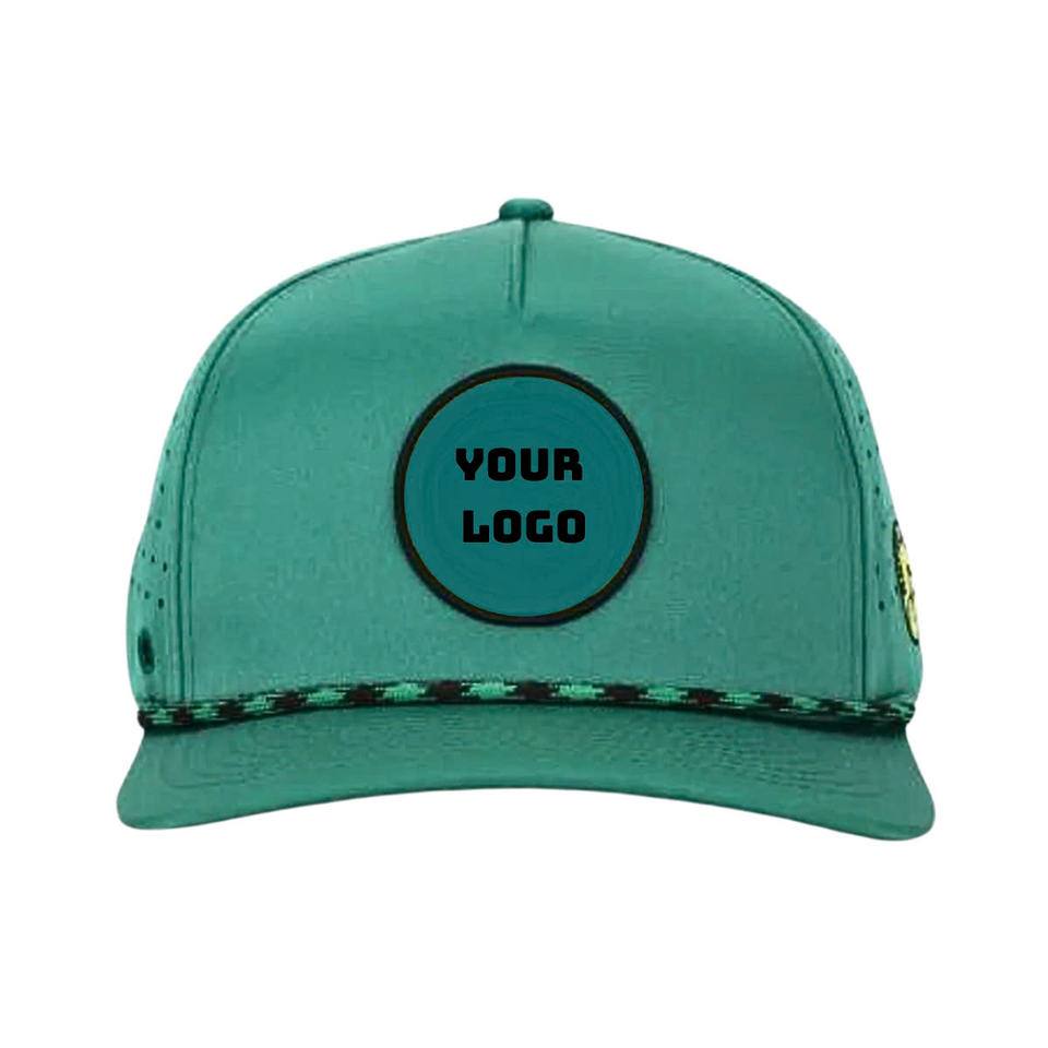 Vente en gros OEM 5 panneaux en caoutchouc personnalisé de haute qualité, logo vert, casquette de baseball découpée au laser, casquette imperméable, casquette de golf en corde