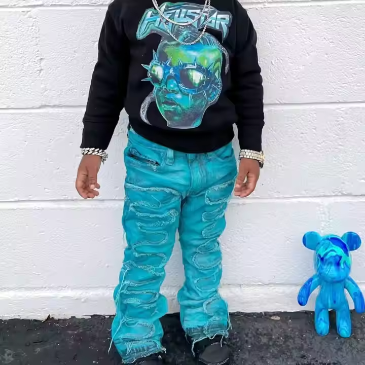 Vente en gros de jeans pour garçons personnalisés High Street lavés avec écussons endommagés Jeans skinny déchirés de créateurs de mode pour enfants