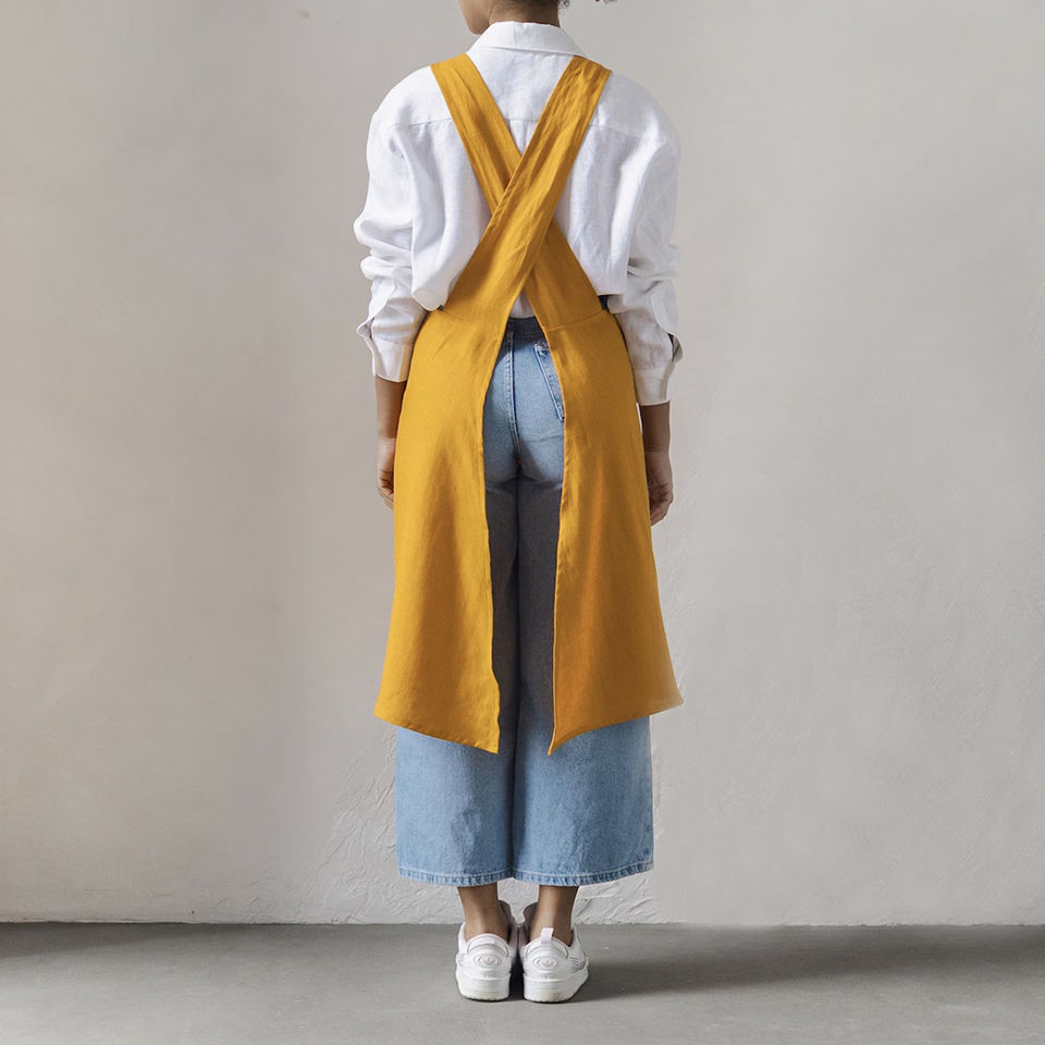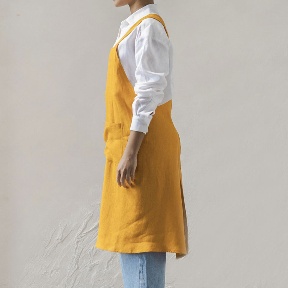 Tablier de cuisine et de jardin en pur lin jaune, style japonais, grande taille, à dos croisé, avec poches, personnalisable en gros