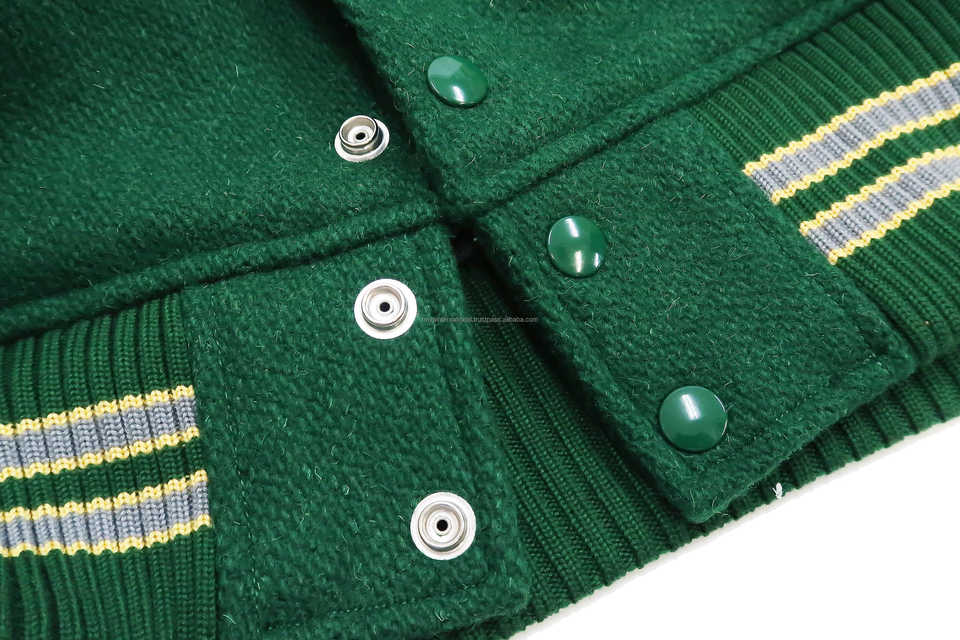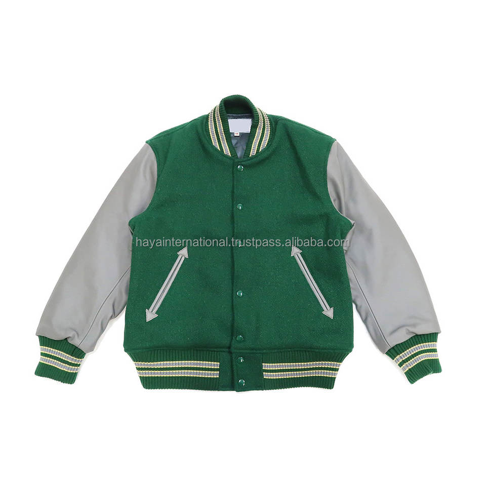 Blouson de baseball coupe-vent personnalisé écologique en gros avec doublure matelassée en toile et polyester, extérieur en laine vert forêt, gris