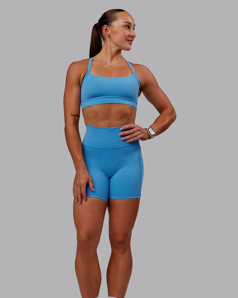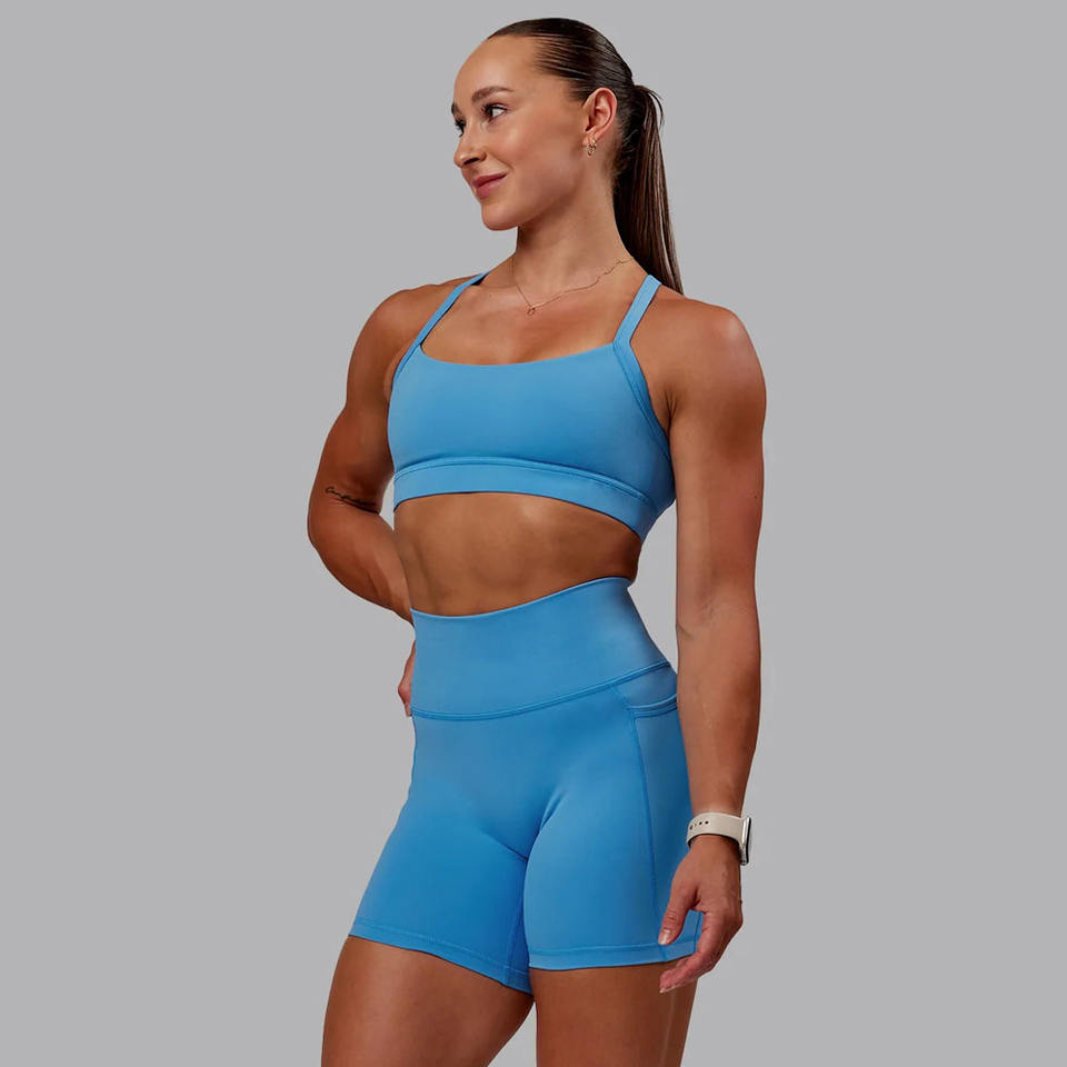 Vente en gros de shorts et soutien-gorge bleus avec logo personnalisé ensembles pour femmes séchage rapide respirant ensemble d'entraînement de gymnastique 2 pièces ensemble plage été pour femmes
