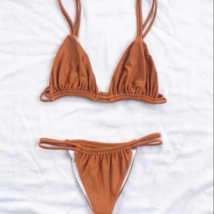 Ensemble 1 pièce de maillot de bain et tenue de plage personnalisé avec logo imprimé sur le devant, style triangle, string froissé en V, en tissu, vente en gros