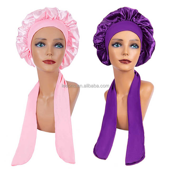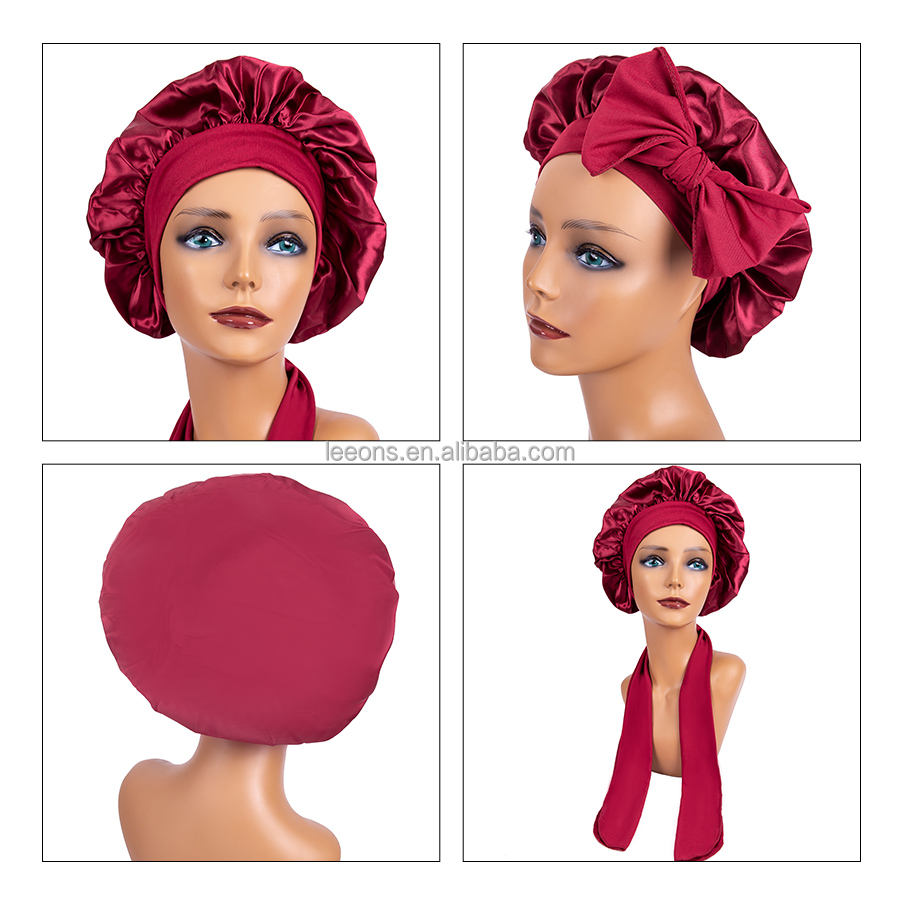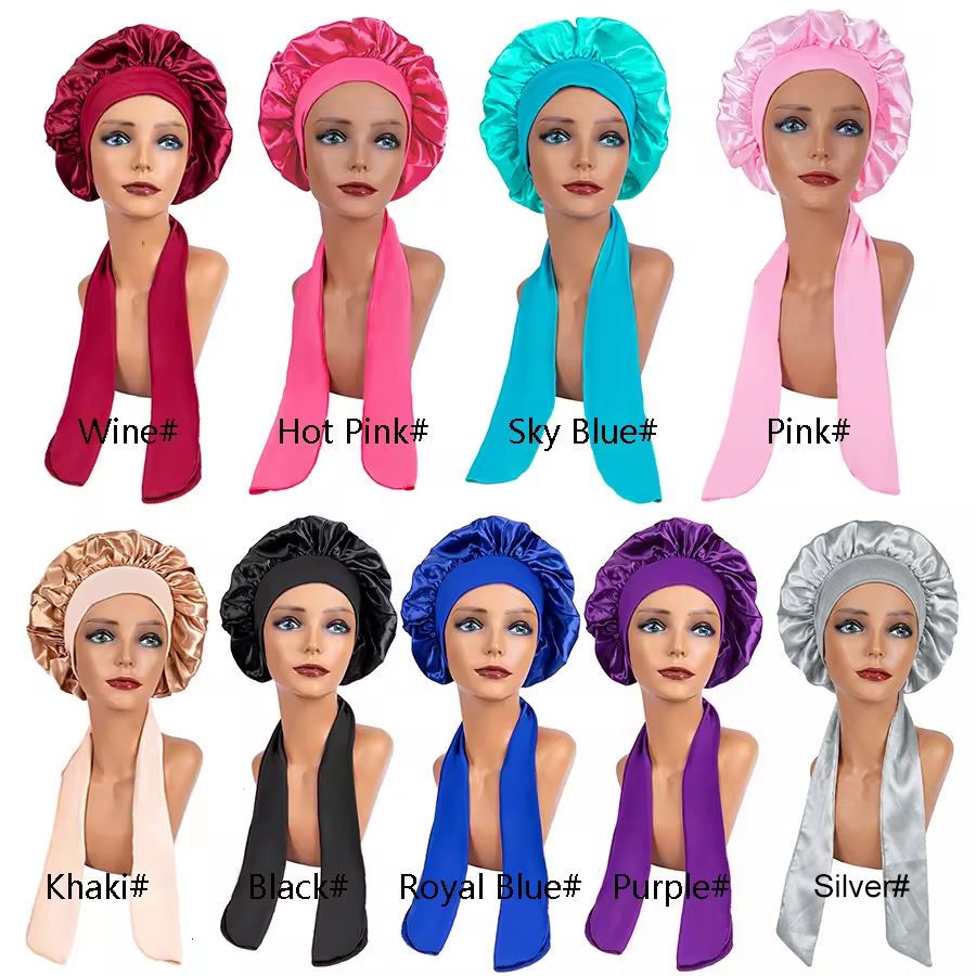 Wholesale Custom Logo Long Braid Bonnets Adjustable Wide Band Night Hat Sleeping Cap Silk Hair Wrap Double Layer Satin Bonnet