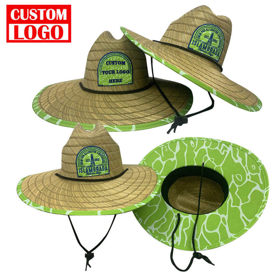 Logo personnalisé Rush tapis creux herbe drapeau américain chapeau de paille avec Logo chapeau de plage en paille à large bord