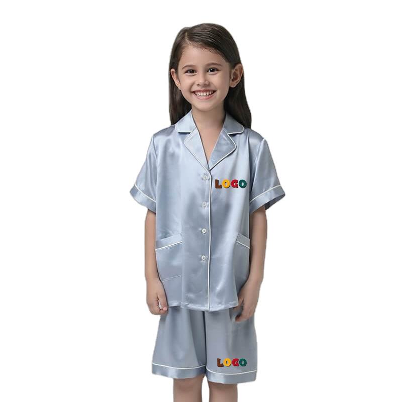 Vente en gros de chemise de nuit en soie avec logo personnalisé Vêtements de nuit à manches courtes pour petites filles Ensemble de pyjamas en satin pour enfants