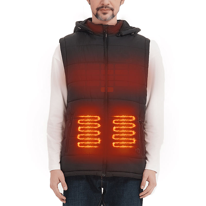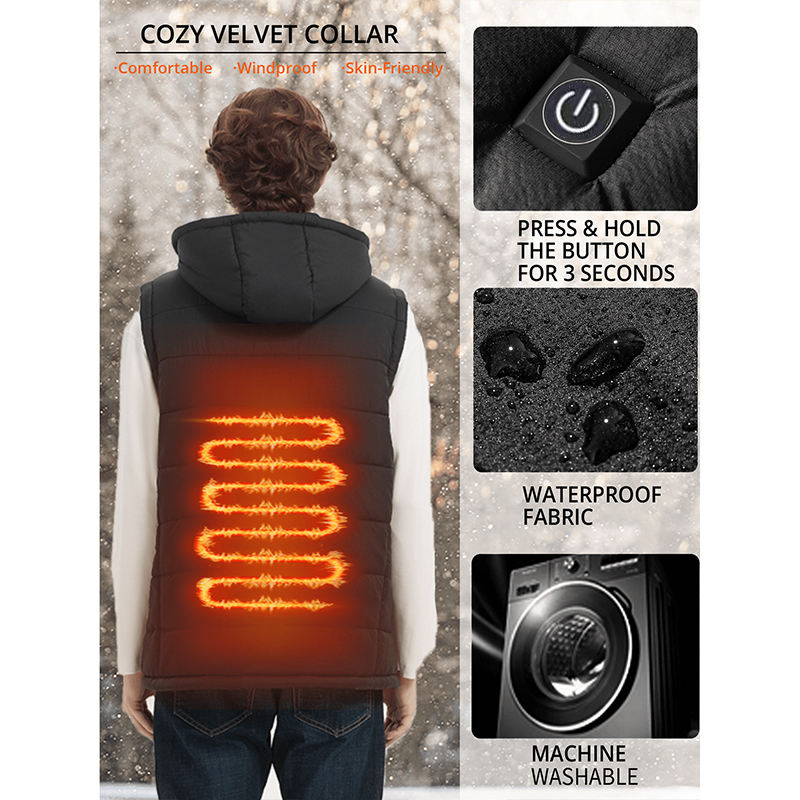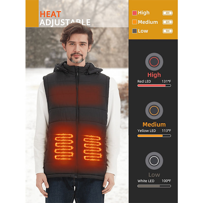 Veste sans manches à capuche chauffante pour homme, légère, personnalisée, en gros, 4 zones de chauffe, contrôle intelligent de la température à 3 niveaux, conception rechargeable