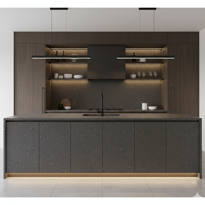 Planche de pierre artificielle en quartz poli gris cristal moderne sur mesure en gros pour comptoirs de cuisine, table, dessus de meuble-lavabo