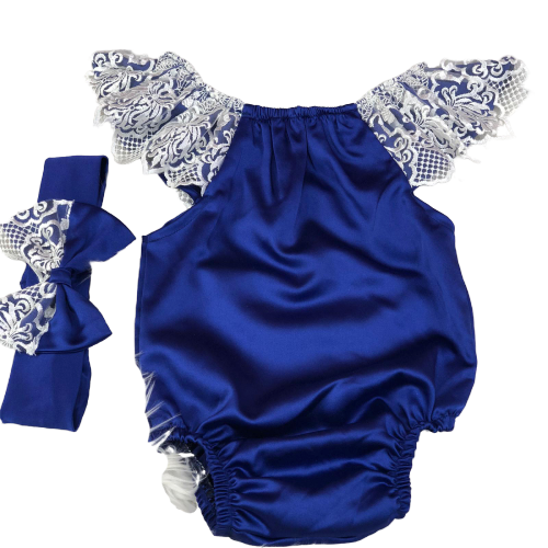 Wholesale Custom Newborn New Design Clothes Kids Modern Luxury Navy Satin Baby Romper Hair Band Summer Baby Girls High Quality