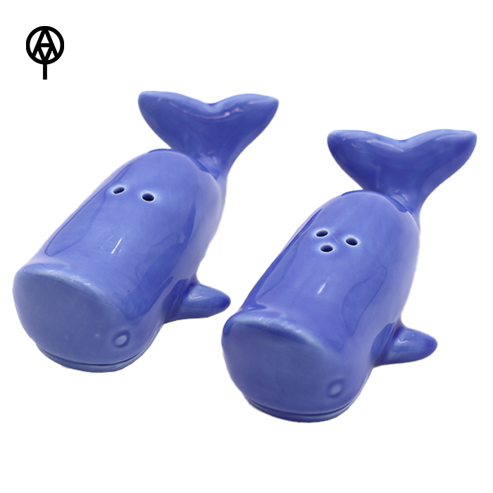 Vente en gros de vaisselle de cuisine sur le thème de l'océan ensemble de salière et poivrière en céramique baleine bleue pour la décoration intérieure côtière