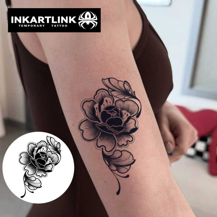 Autocollant de tatouage semi-permanent personnalisé en gros, motif pivoine, style néo-traditionnel, à base de plantes, tenue 15 jours, pour bras et épaule