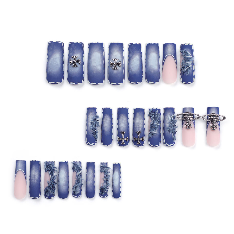 Vente en gros de faux ongles personnalisés à presser, Ballerina Blue, longs, effet denim délavé, forme cercueil, French Manucure, en ABS, à coller