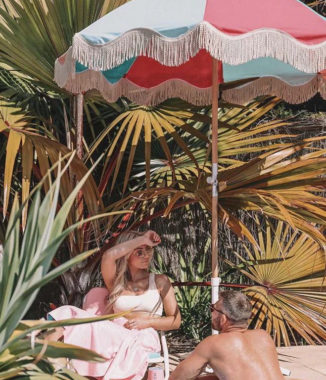 Parasol de plage personnalisé en gros avec motif imprimé, parapluie OEM à bord festonné avec pompons, auvent robuste anti-UV50+ pour complexe hôtelier