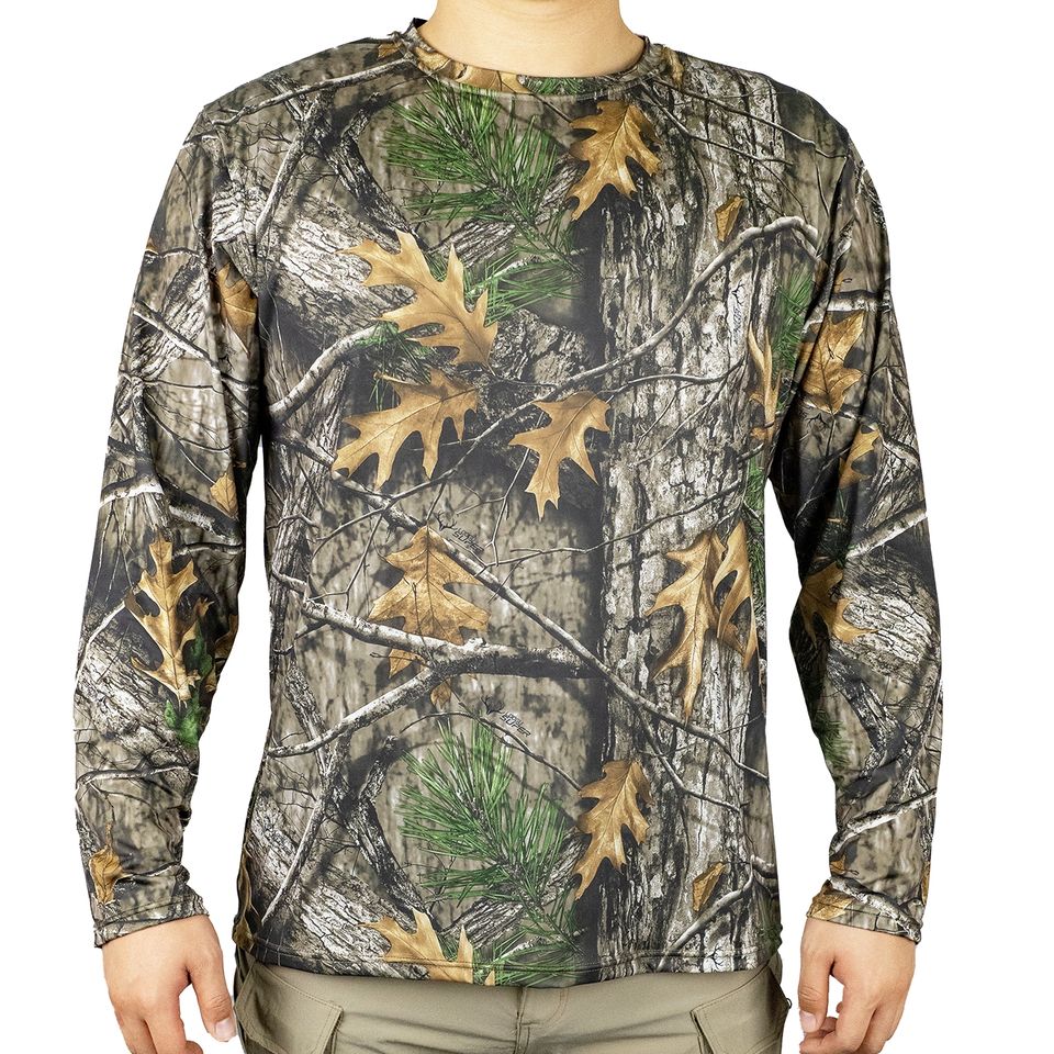 Vente en gros de t-shirts à manches longues pour hommes en polyester 100% à séchage rapide, imprimés sur mesure, UPF50+, camouflage, pour la chasse, la pêche, la randonnée