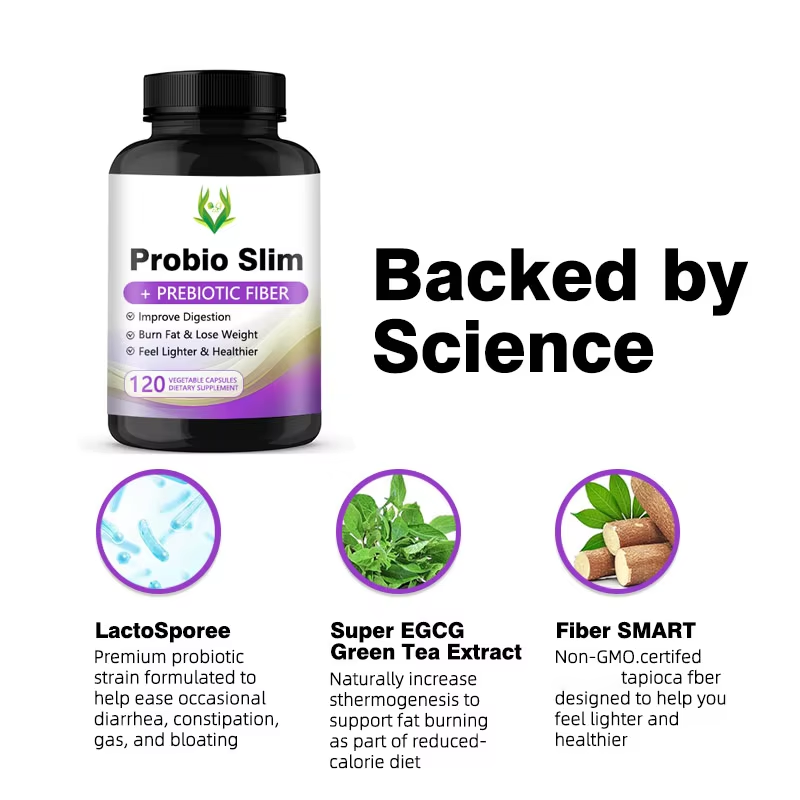 Vente en gros de capsules minces probiotiques personnalisées avec fibres prébiotiques pour améliorer la digestion, aider à brûler les graisses pour les femmes, gérer le poids