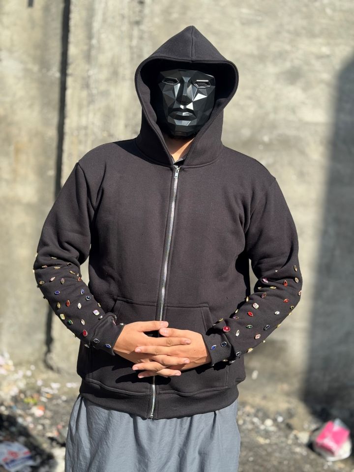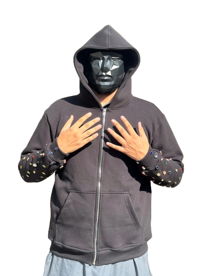 Sweat à capuche zippé personnalisé avec strass en gros | Vêtements de rue unisexes en molleton 100% coton pour l'hiver, multicolores, écologiques et respirants