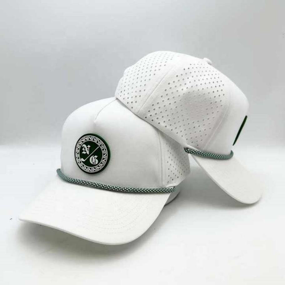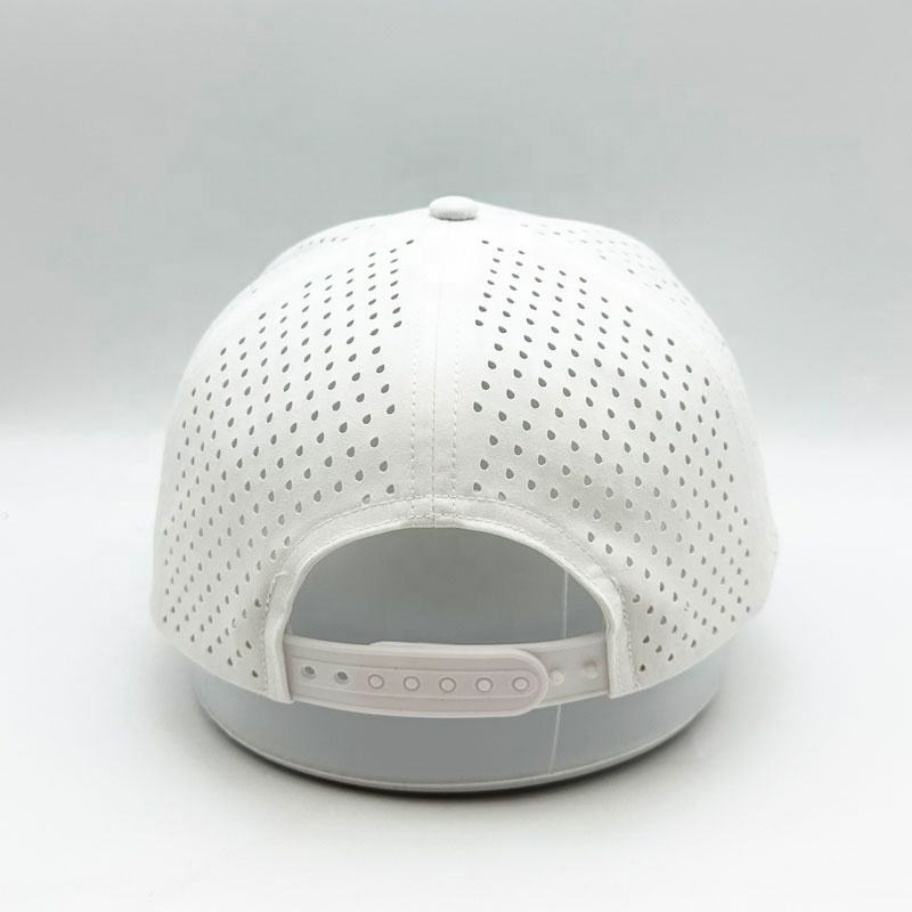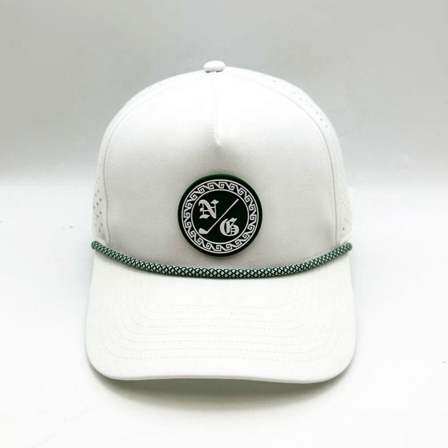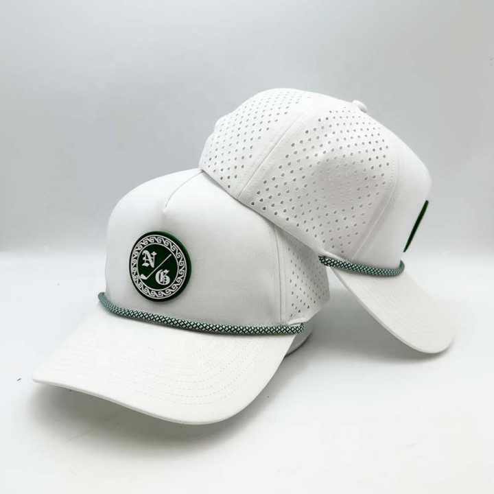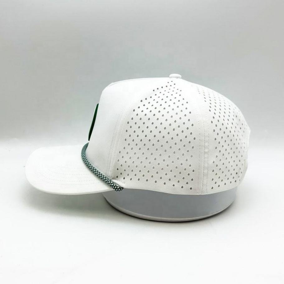 Casquette de baseball et de golf sportive à 5 panneaux, imperméable, avec logo personnalisé en patch de caoutchouc PVC, perforations découpées au laser pour le surf