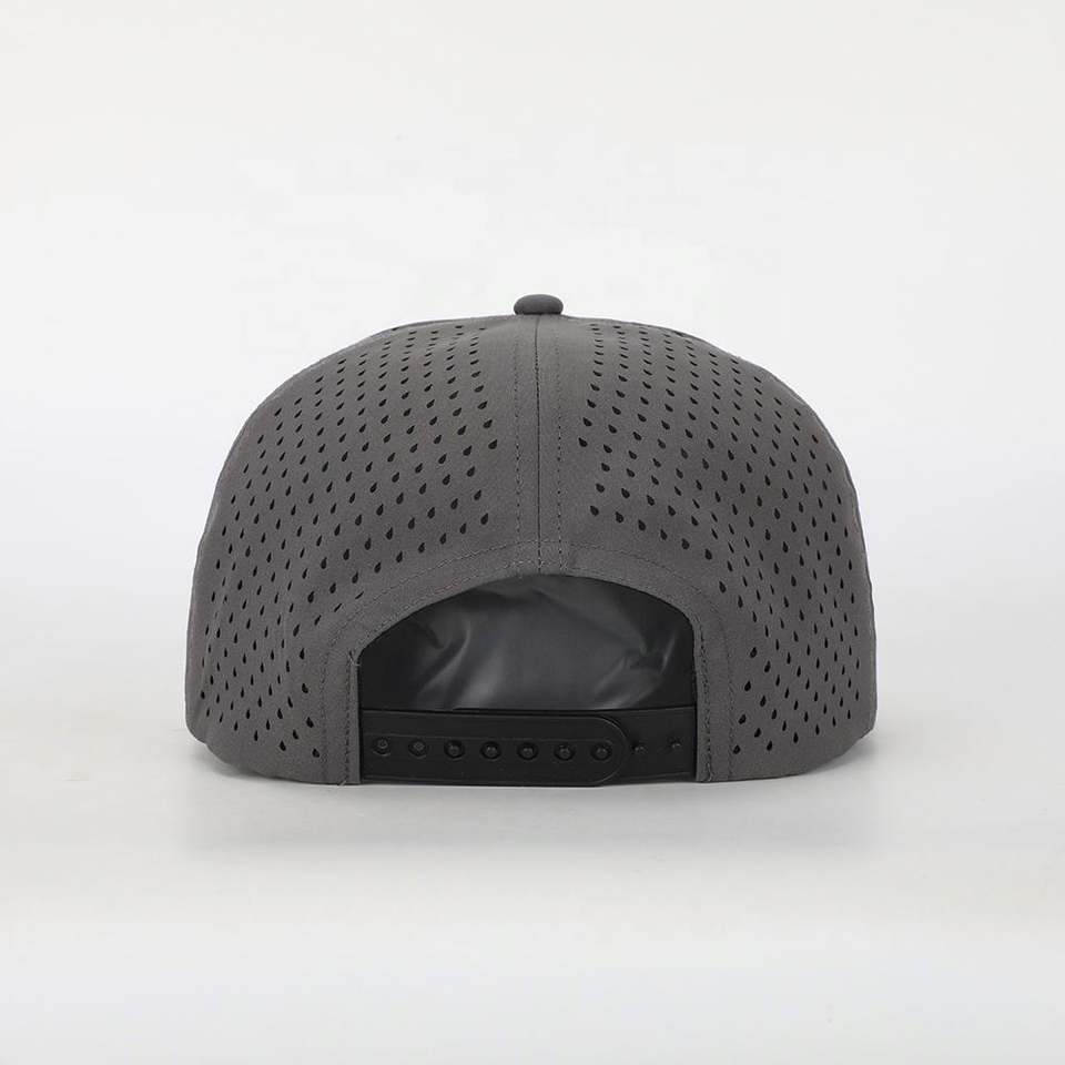 Chapeau 7 panneaux à bord plat gris polyester Sport Gorras casquette Snapback avec trou découpé au laser Patch Logo en caoutchouc personnalisé de haute qualité vente en gros