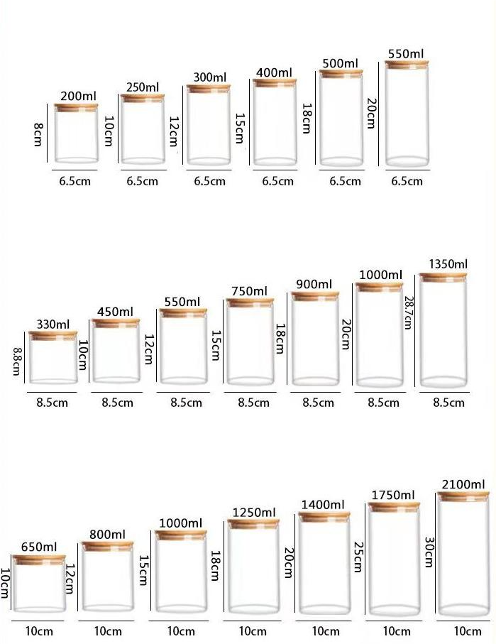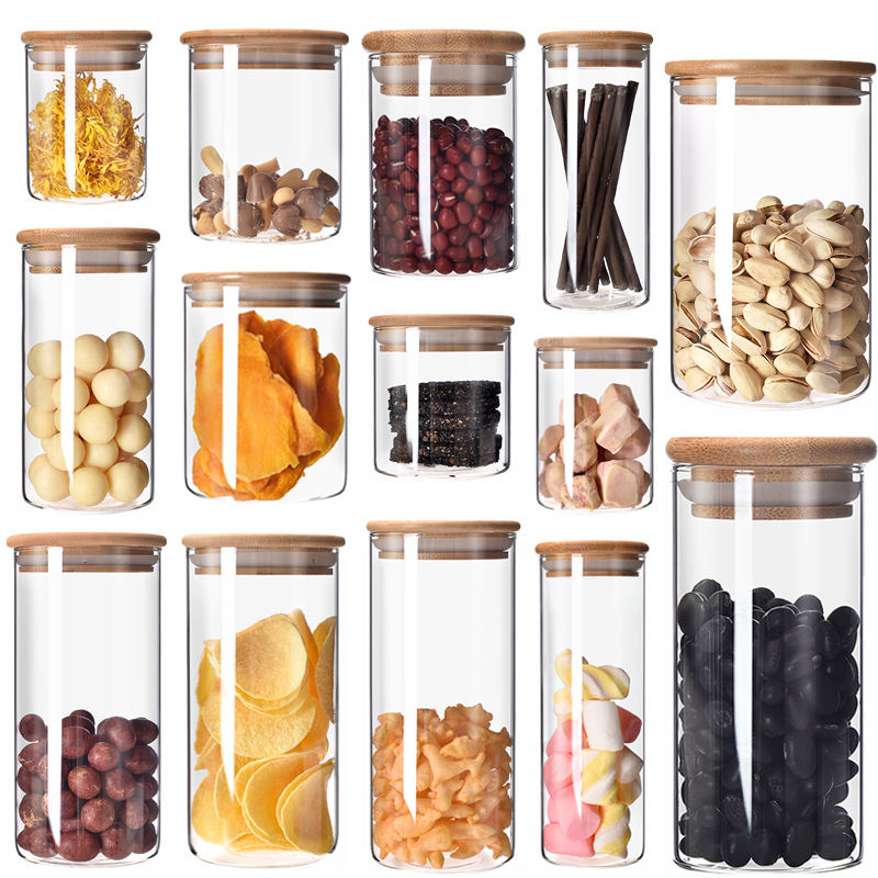 Vente en gros de bocaux en verre à haute teneur en borosilicate écologique de taille personnalisée avec couvercle en bambou pour le stockage des épices alimentaires et l'agencement de la cuisine