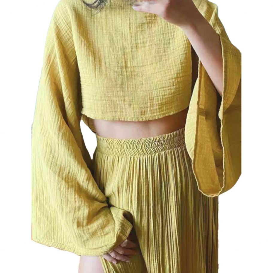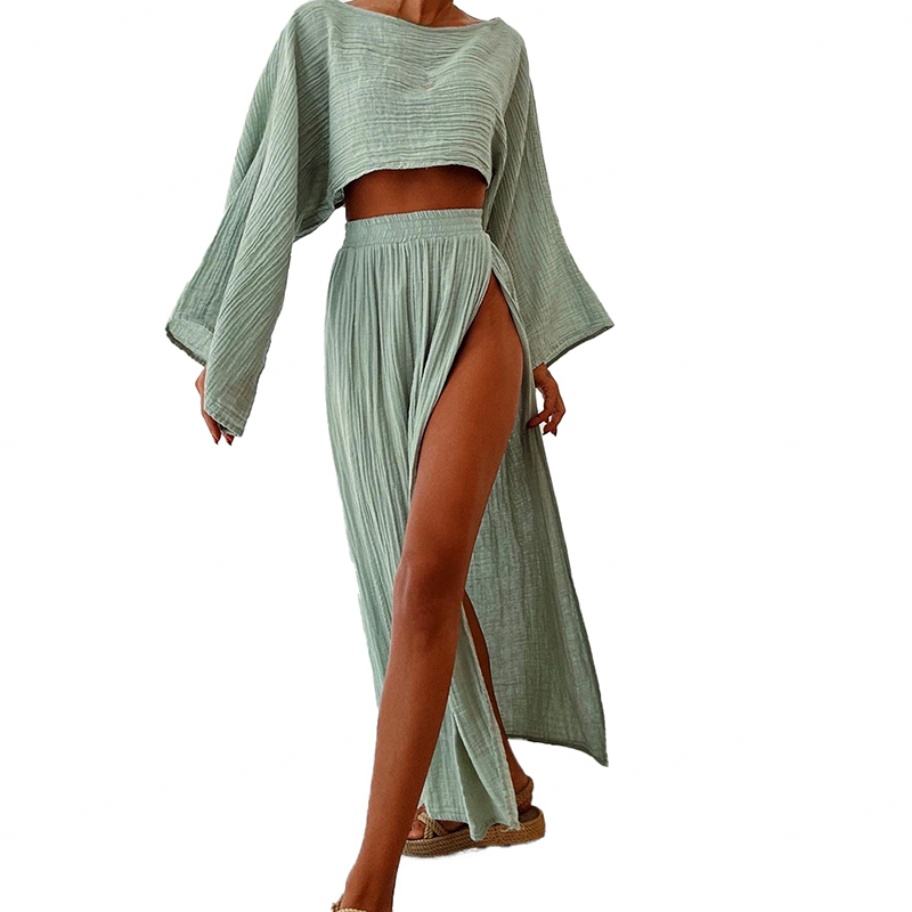 Ensemble deux pièces élégant en lin mélangé sur mesure pour femme, idéal pour les loisirs et les vacances, avec haut taille haute et design unique à fente