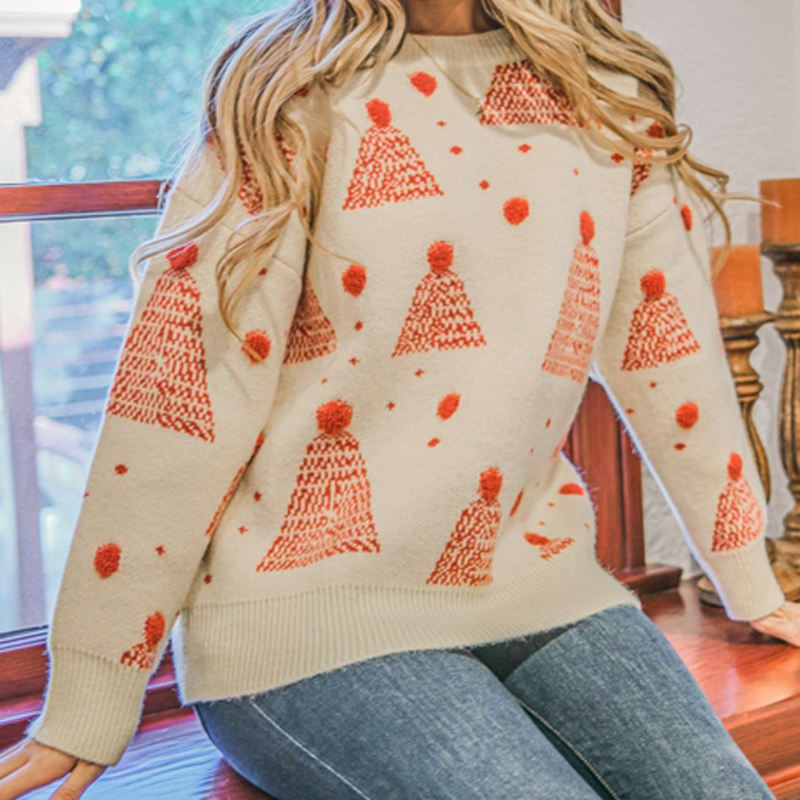 Product Name:holiday Ttree print pompom pullover sweater women