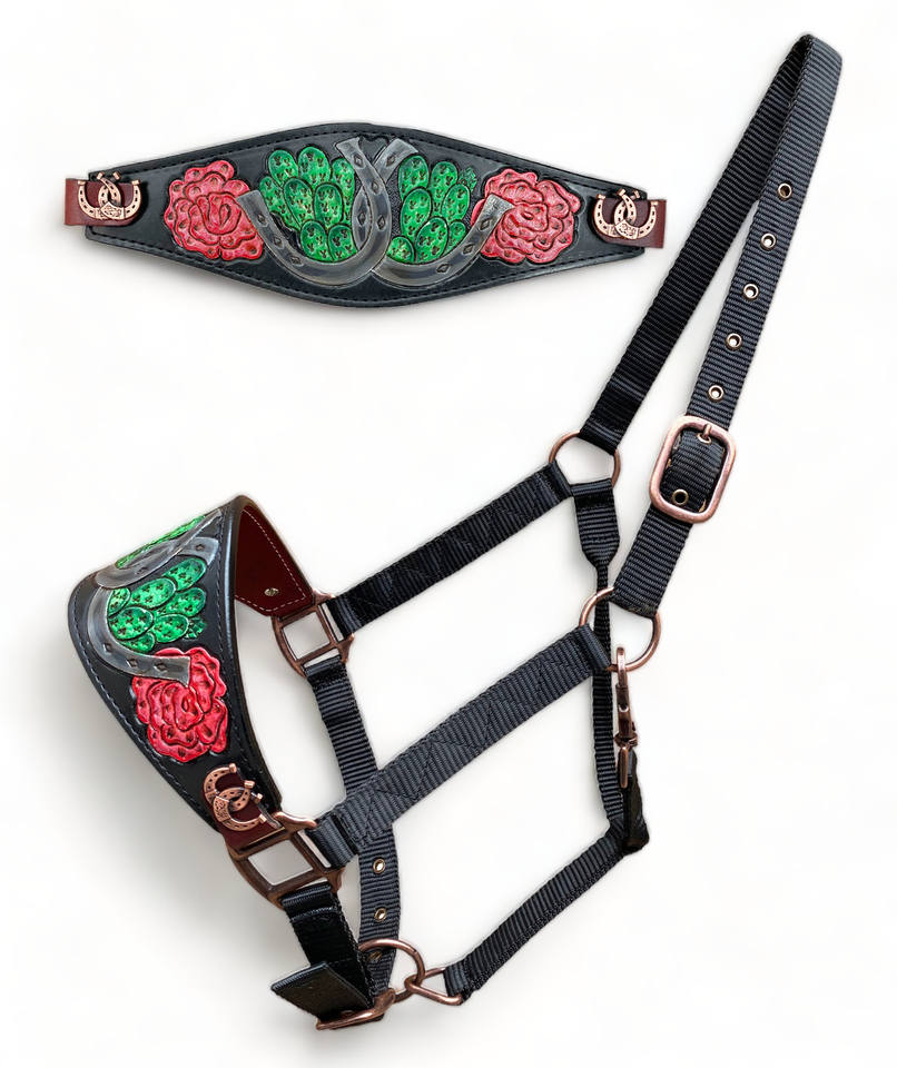 Horse Bronc Halter With Hand Carving With Rose And Cactus ArroundProduct Name