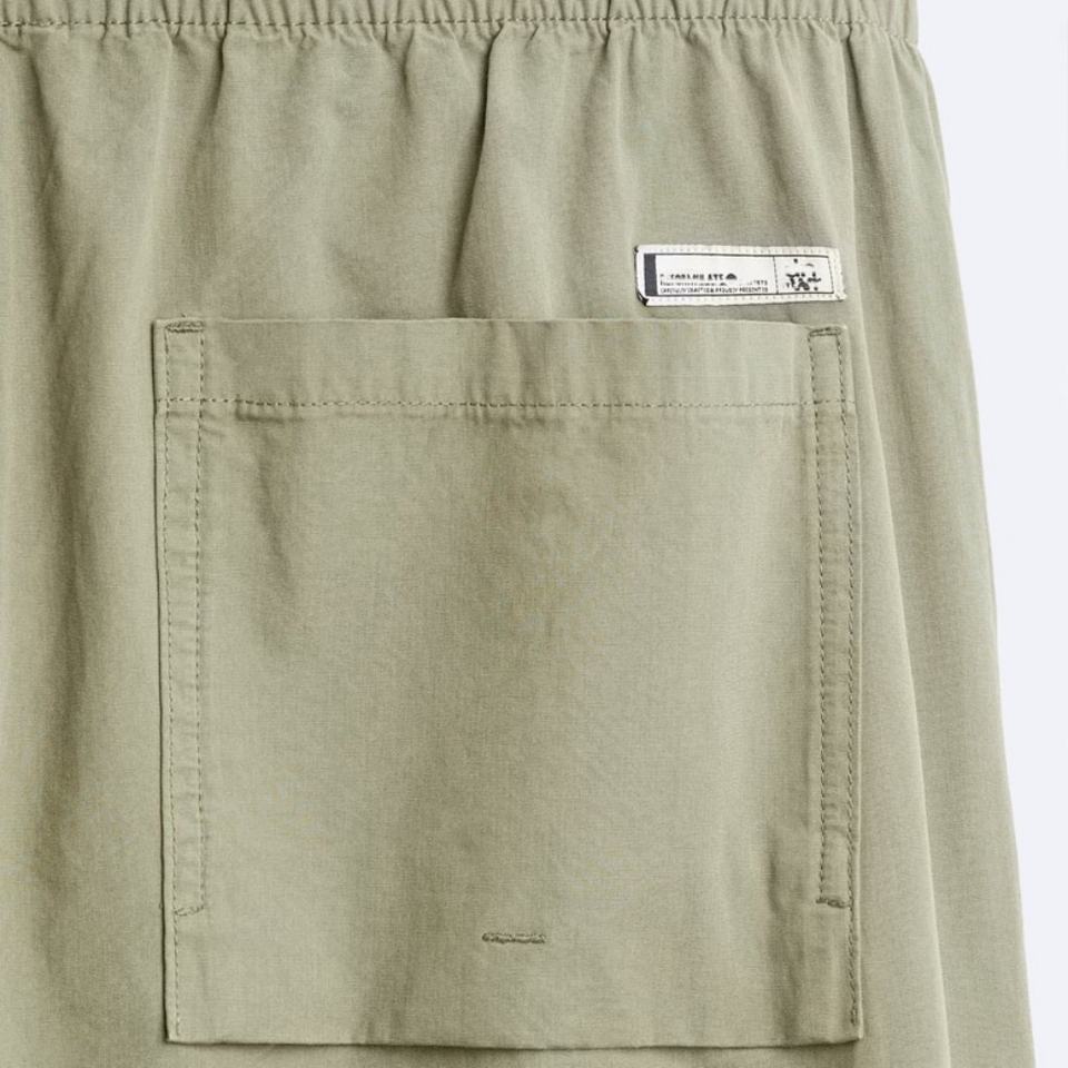 Pantalon à plis aux genoux avec taille élastique ajustable par cordon de serrage.