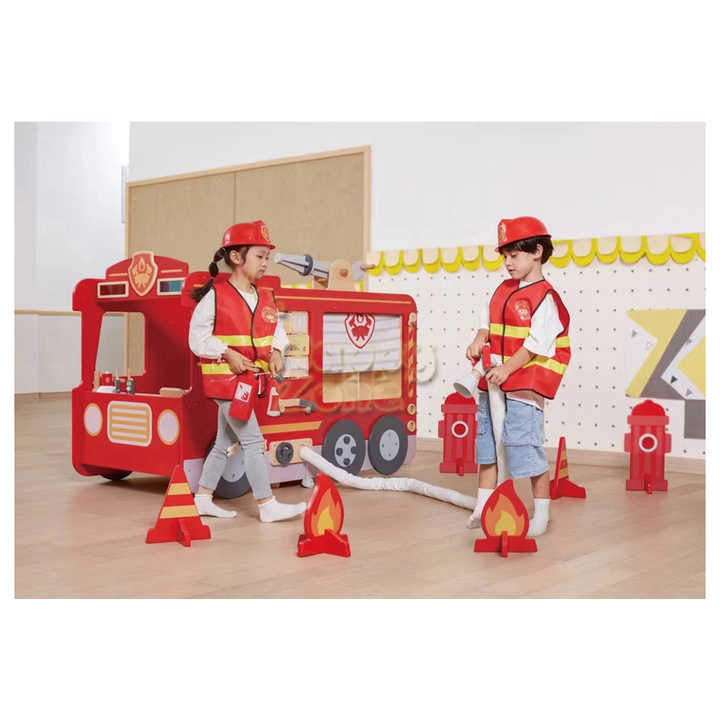 Vente en gros de jeu de rôle pompier personnalisé Ensemble parc d'attractions intérieur avec camion de pompier en bois et acier en fibre de verre pour