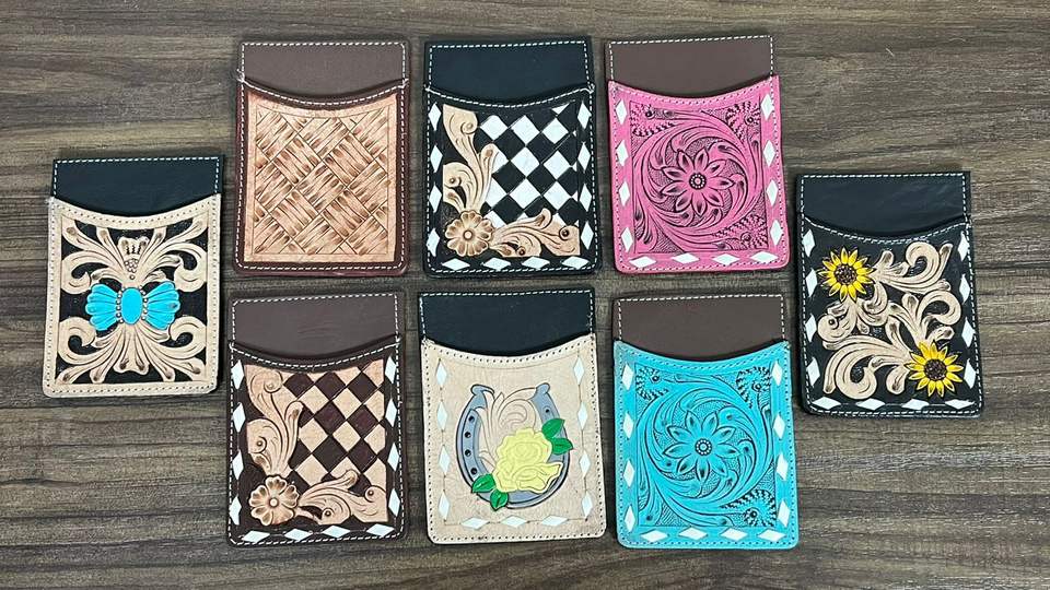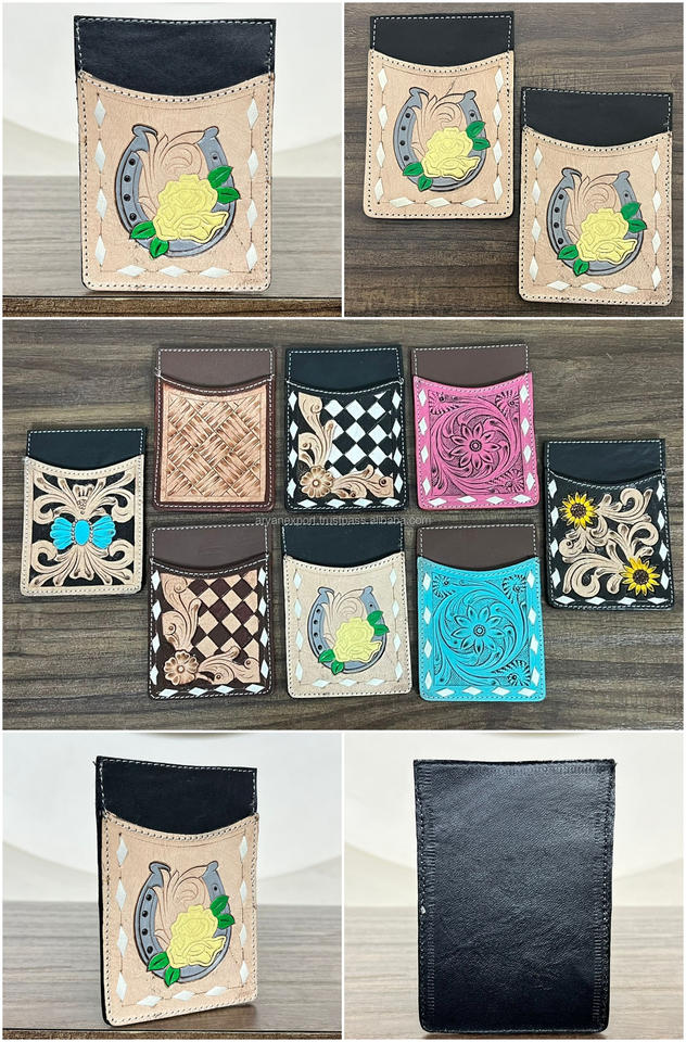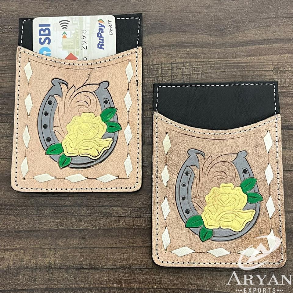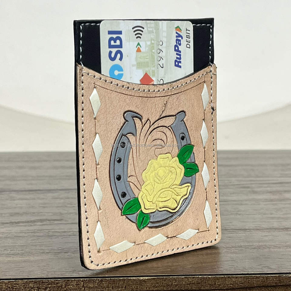 Portefeuille porte-cartes en cuir de vachette artisanal personnalisé en gros, motif floral et fer à cheval, style western, porte-cartes ATM de poche