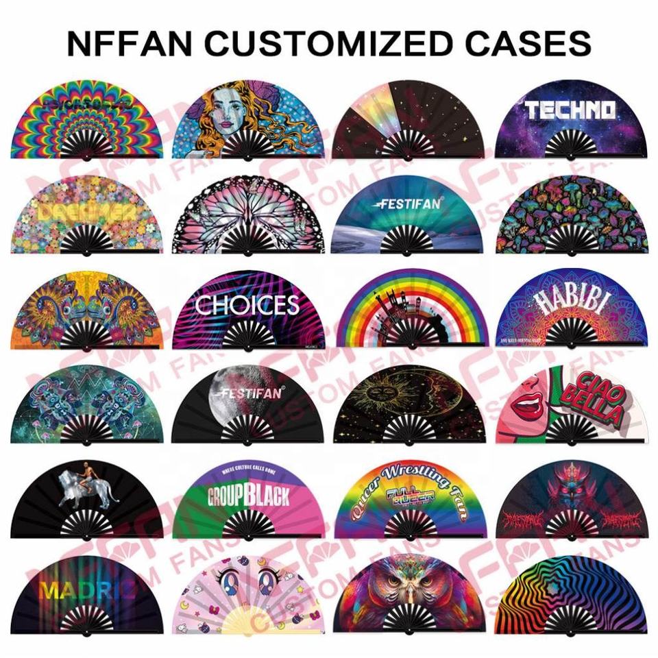 Vente en gros de grands éventails en bambou pliants personnalisés avec son clac pour tissu Raves UV Glow