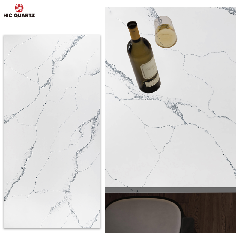 Dalles de pierre de quartz Calacatta blanc style marbre personnalisé en gros pour comptoirs de cuisine dessus de vanité dessus de table hôtel