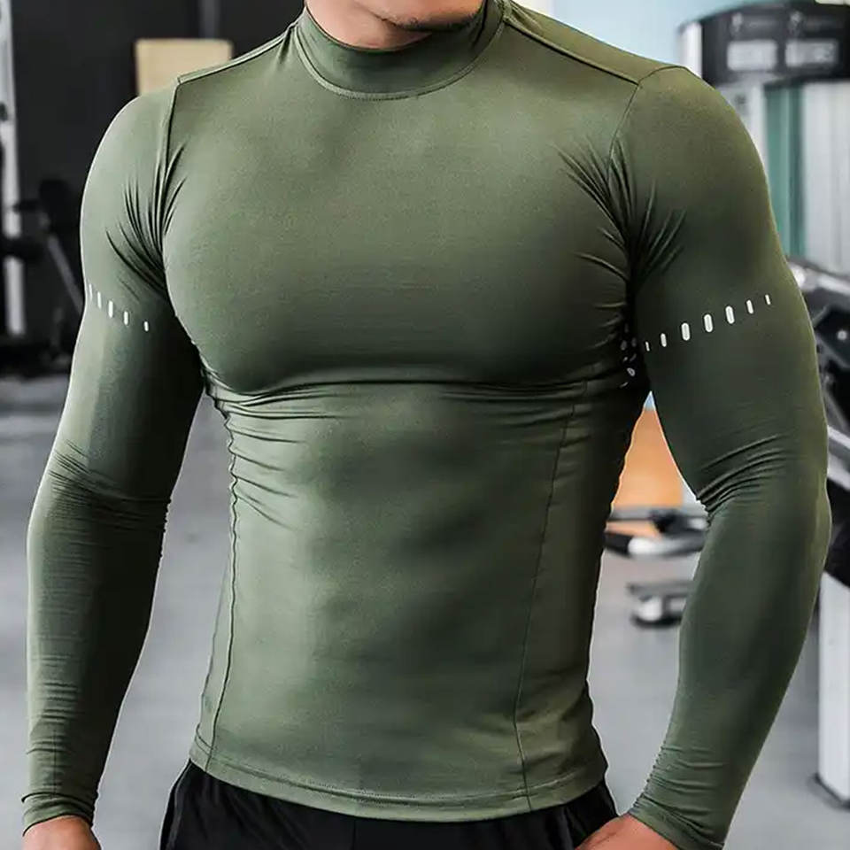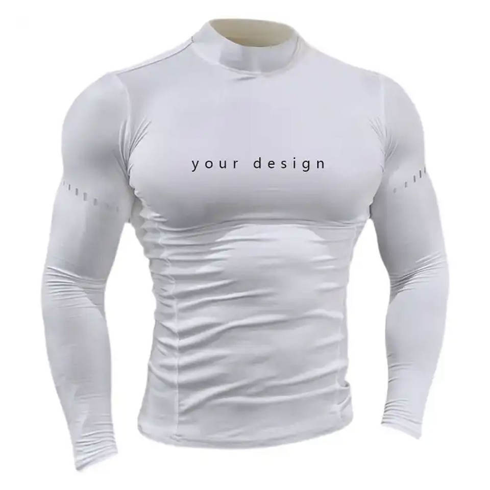 Vente en gros de t-shirts de compression pour hommes personnalisés, à séchage rapide, col rond, manches longues, haut de sport respirant