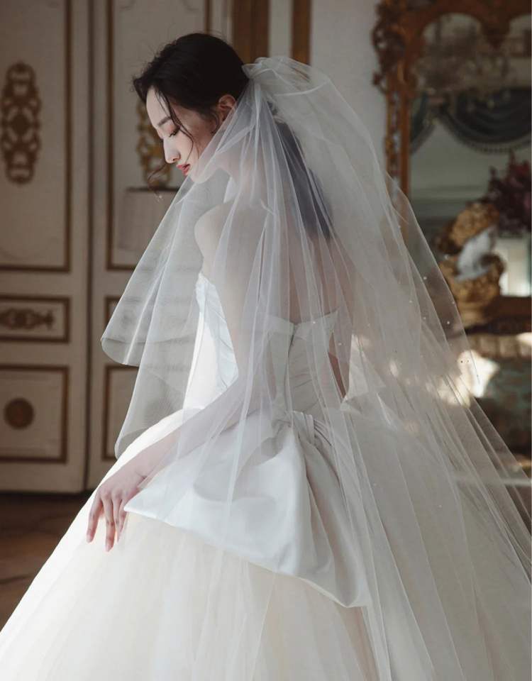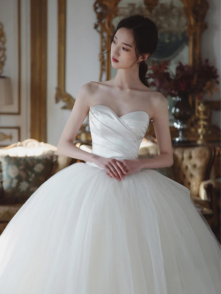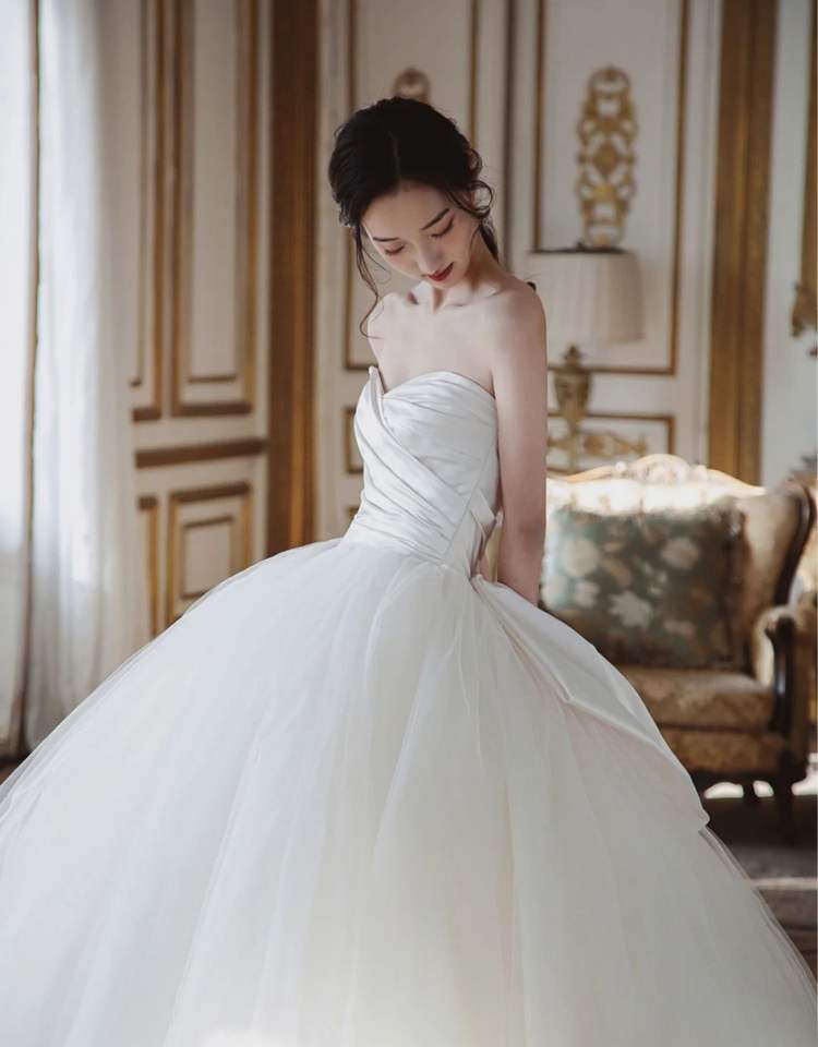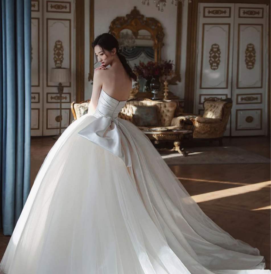 Robe de mariée bustier personnalisée en gros, nouvelle collection, style simple Qi Di, fin, style Hepburn, coréen, nœud, voile léger français