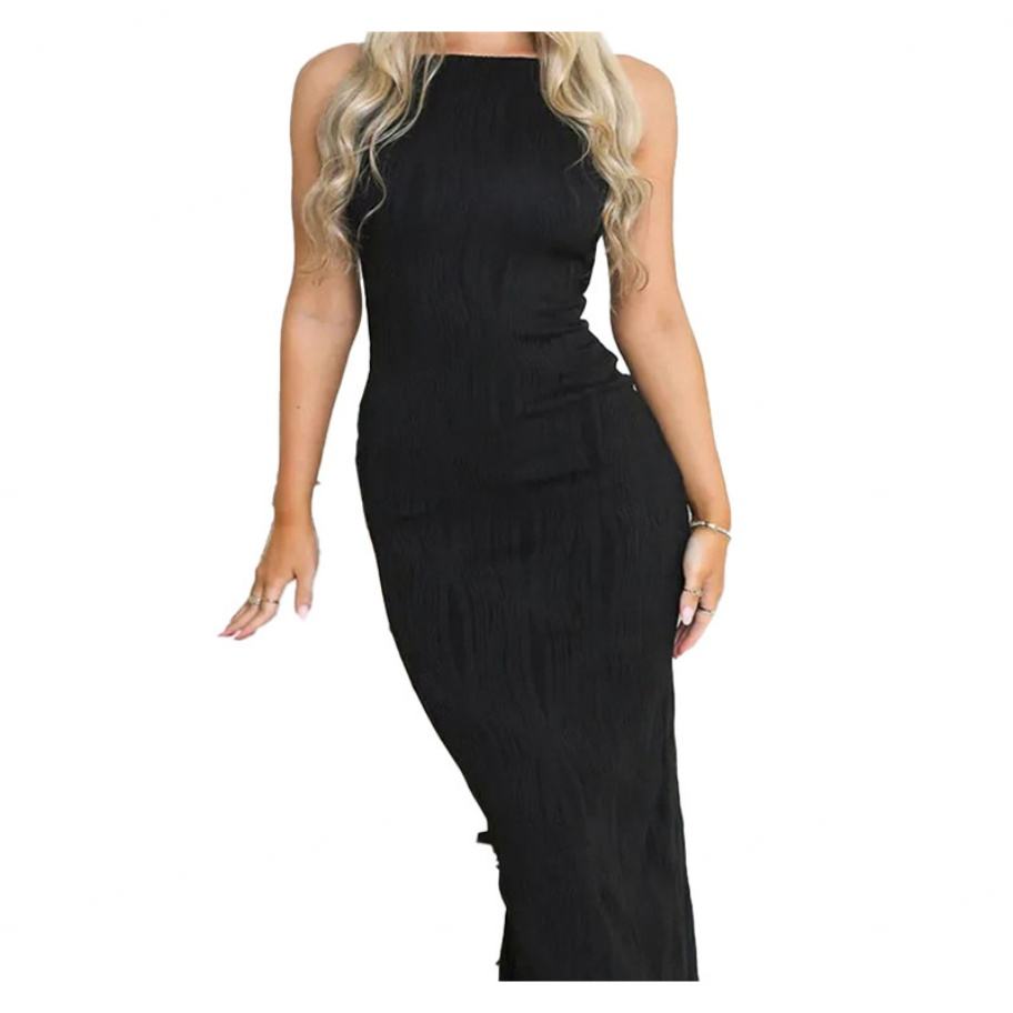 Vente en gros OEM personnalisé de haute qualité Robe midi pour femme à taille naturelle, coupe ajustée, sexy, col licou, sans manches, décontractée, mode, tridimensionnelle