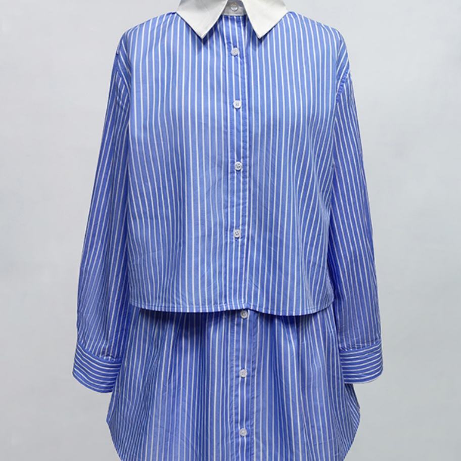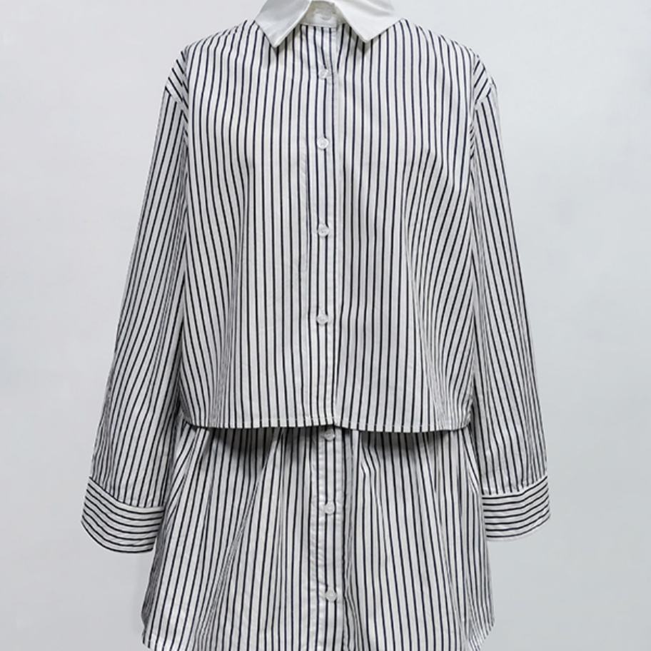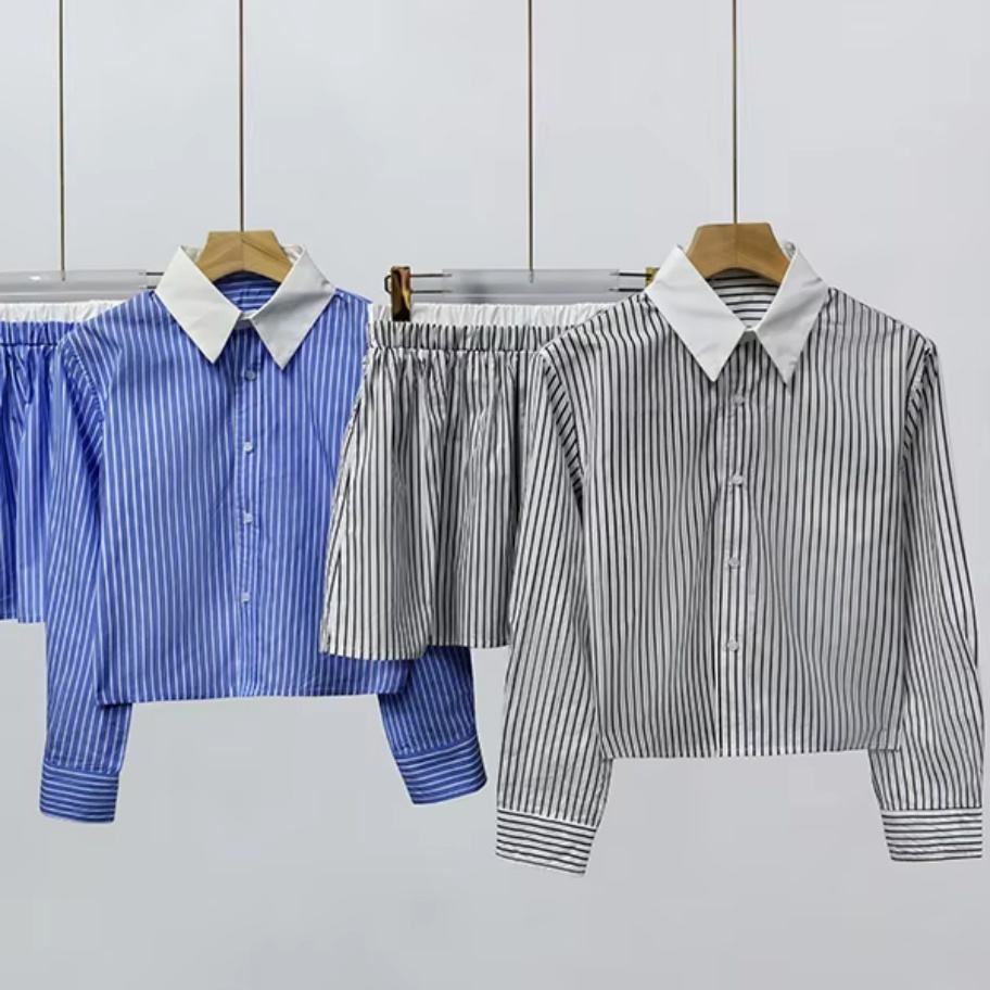 Vente en gros de costumes pour femmes personnalisés OEM ODM de haute qualité, mode décontractée, col rabattu, chemisier à rayures à manches longues et ensembles de jupes