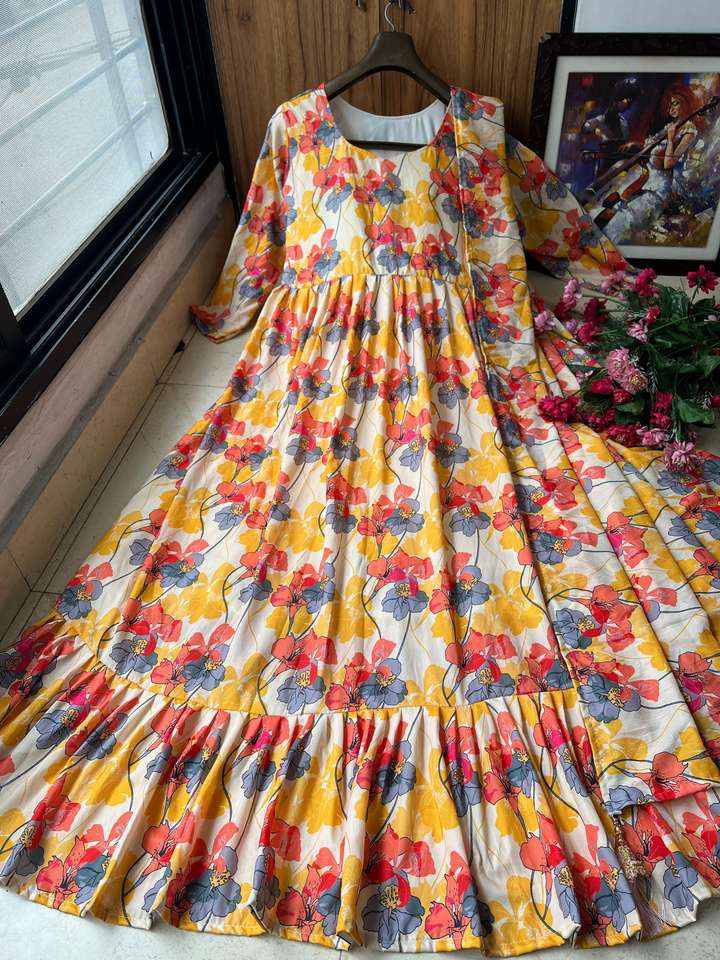 Vente en gros Designer Mousseline de Coton Multi Couleur Impression Numérique Robe Anarkali Avec Dupatta Ensemble Prêt à Porter Robe Anarkali