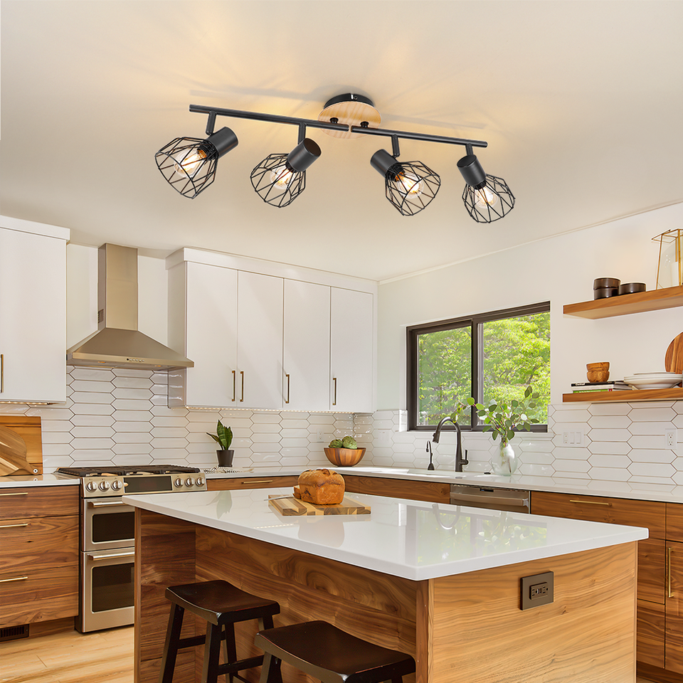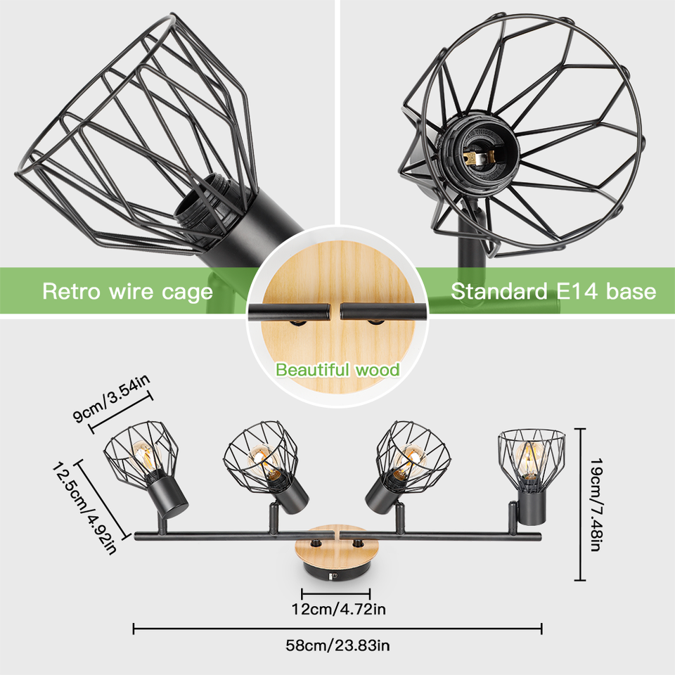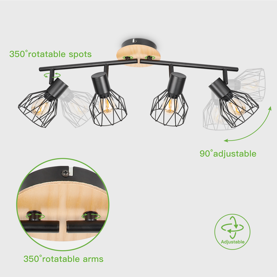 Spot de plafond E14 en gros, réglable, 4 têtes rotatives, LED moderne, base en fer forgé noir et bois, pour maison, salon, magasin, intérieur