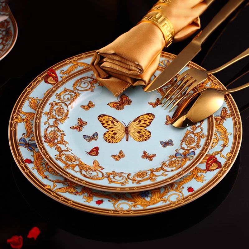 Vente en gros de services de table en porcelaine de luxe écologiques à motif papillon, assiettes de style classique de 8/10 pouces pour la maison et les hôtels