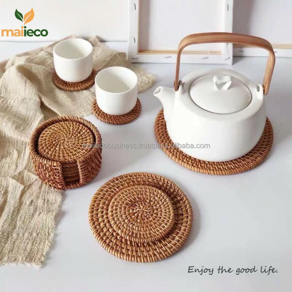 Vente en gros de dessous de verre en rotin rustique écologique nouveau design tapis de vaisselle et tampons en verre pour chargeur de salon