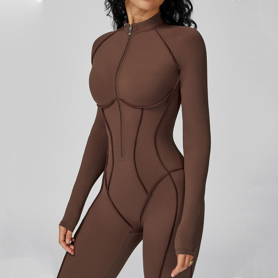 Vente en gros de vêtements de gym élastiques à séchage rapide demi-fermeture éclair à manches longues pour femmes combinaisons de fitness yoga une pièce