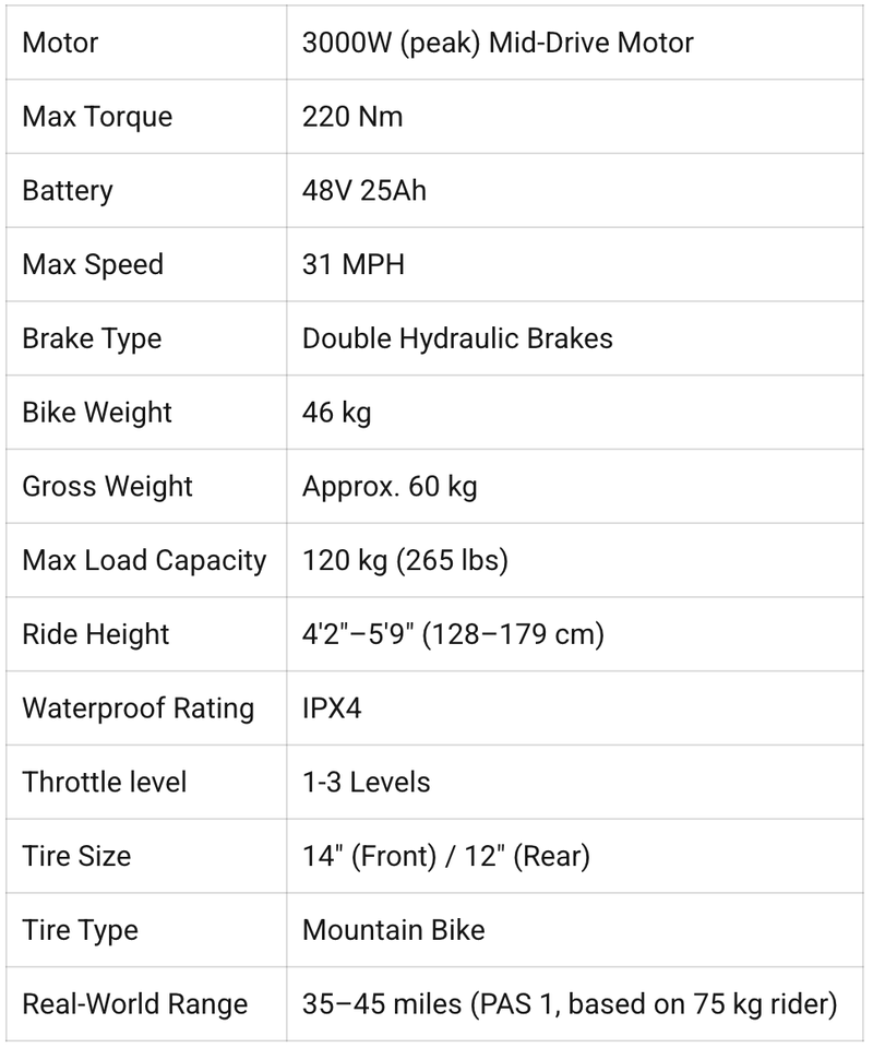 Motor:3000W (peak) Mid-Drive Motor