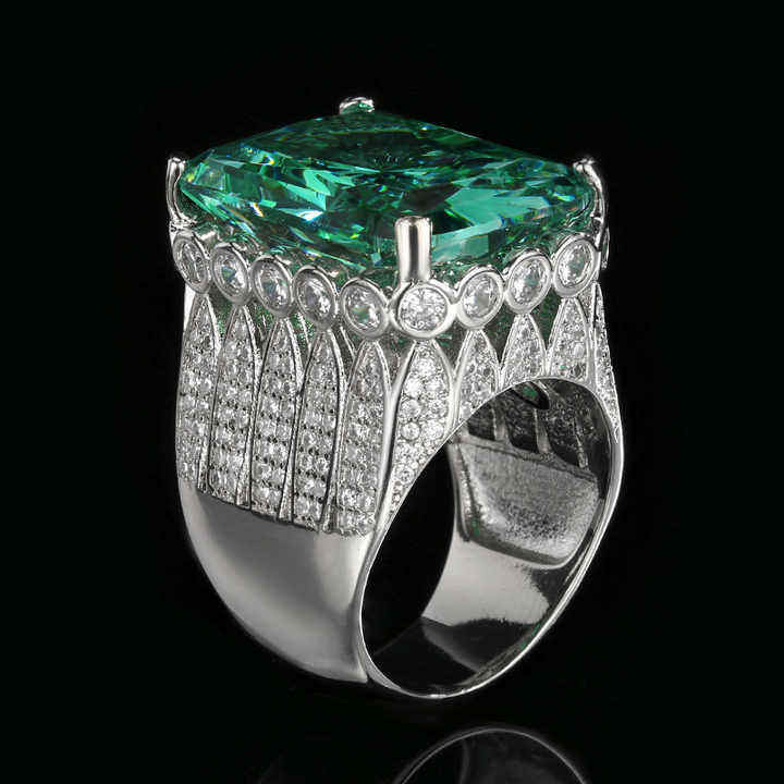 Wholesale Emerald Cut Green Stone Ring for Men Big Statement Silver Plated Bling Iced Out Hip Hop Party Jewelry Fashion Gift