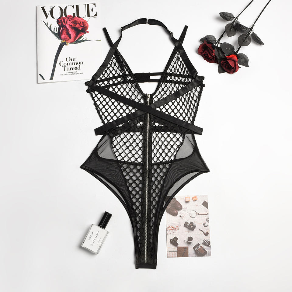 En gros Body femme sexy transparent en résille exotique à col licou, ensemble de lingerie une pièce